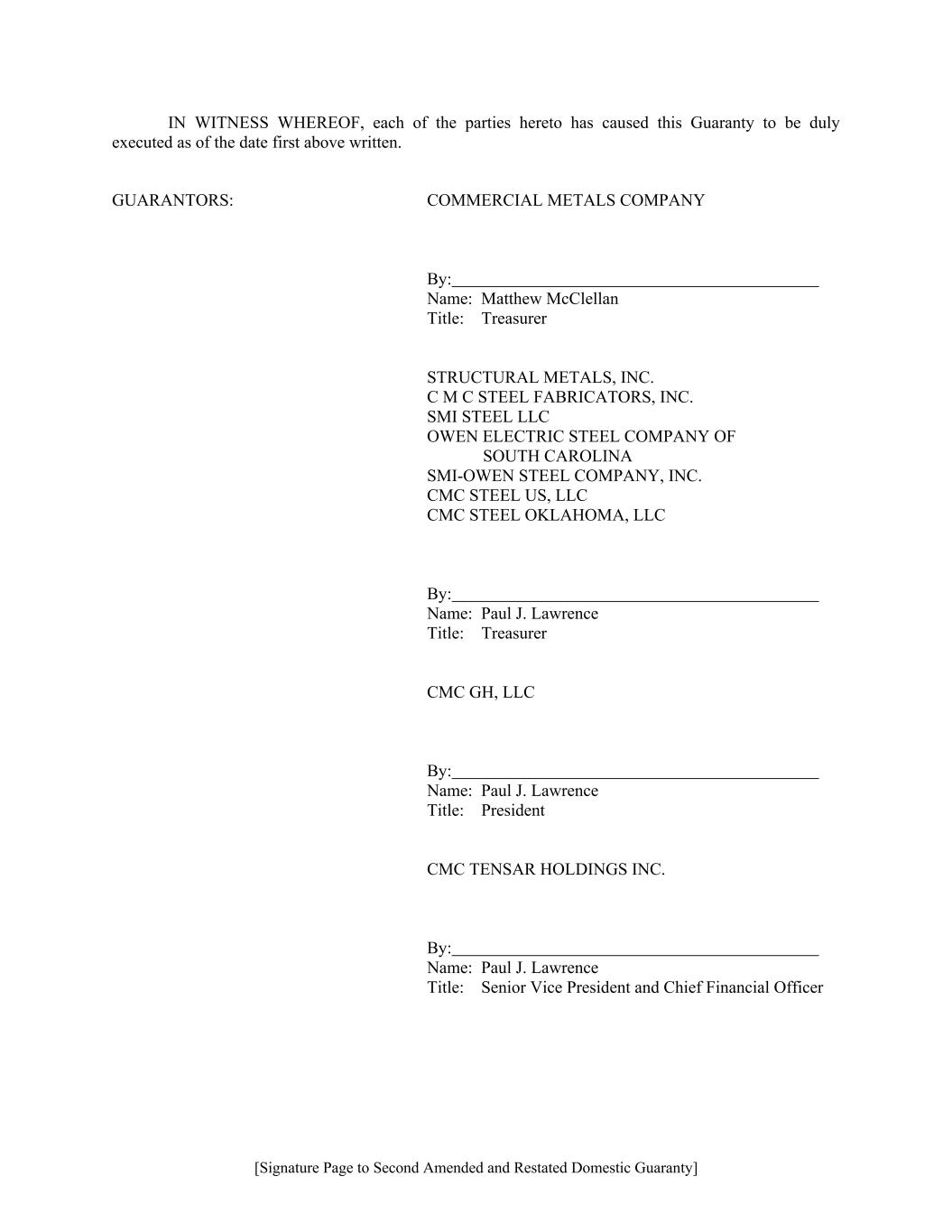 [Signature Page to Second Amended and Restated Domestic Guaranty] IN WITNESS WHEREOF, each of the parties hereto has caused this Guaranty to be duly executed as of the date first above written. GUARANTORS: COMMERCIAL METALS COMPANY By: Name: Matthew McClellan Title: Treasurer STRUCTURAL METALS, INC. C M C STEEL FABRICATORS, INC. SMI STEEL LLC OWEN ELECTRIC STEEL COMPANY OF SOUTH CAROLINA SMI-OWEN STEEL COMPANY, INC. CMC STEEL US, LLC CMC STEEL OKLAHOMA, LLC By: Name: Paul J. Lawrence Title: Treasurer CMC GH, LLC By: Name: Paul J. Lawrence Title: President CMC TENSAR HOLDINGS INC. By: Name: Paul J. Lawrence Title: Senior Vice President and Chief Financial Officer