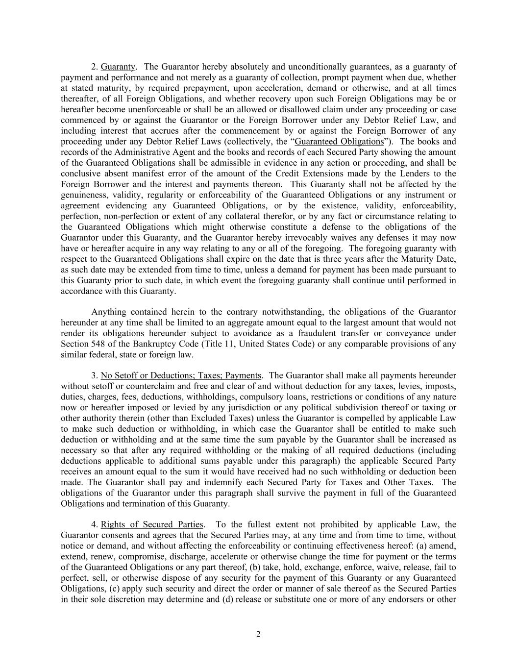 2 2. Guaranty. The Guarantor hereby absolutely and unconditionally guarantees, as a guaranty of payment and performance and not merely as a guaranty of collection, prompt payment when due, whether at stated maturity, by required prepayment, upon acceleration, demand or otherwise, and at all times thereafter, of all Foreign Obligations, and whether recovery upon such Foreign Obligations may be or hereafter become unenforceable or shall be an allowed or disallowed claim under any proceeding or case commenced by or against the Guarantor or the Foreign Borrower under any Debtor Relief Law, and including interest that accrues after the commencement by or against the Foreign Borrower of any proceeding under any Debtor Relief Laws (collectively, the “Guaranteed Obligations”). The books and records of the Administrative Agent and the books and records of each Secured Party showing the amount of the Guaranteed Obligations shall be admissible in evidence in any action or proceeding, and shall be conclusive absent manifest error of the amount of the Credit Extensions made by the Lenders to the Foreign Borrower and the interest and payments thereon. This Guaranty shall not be affected by the genuineness, validity, regularity or enforceability of the Guaranteed Obligations or any instrument or agreement evidencing any Guaranteed Obligations, or by the existence, validity, enforceability, perfection, non-perfection or extent of any collateral therefor, or by any fact or circumstance relating to the Guaranteed Obligations which might otherwise constitute a defense to the obligations of the Guarantor under this Guaranty, and the Guarantor hereby irrevocably waives any defenses it may now have or hereafter acquire in any way relating to any or all of the foregoing. The foregoing guaranty with respect to the Guaranteed Obligations shall expire on the date that is three years after the Maturity Date, as such date may be extended from time to time, unless a demand for payment has been made pursuant to this Guaranty prior to such date, in which event the foregoing guaranty shall continue until performed in accordance with this Guaranty. Anything contained herein to the contrary notwithstanding, the obligations of the Guarantor hereunder at any time shall be limited to an aggregate amount equal to the largest amount that would not render its obligations hereunder subject to avoidance as a fraudulent transfer or conveyance under Section 548 of the Bankruptcy Code (Title 11, United States Code) or any comparable provisions of any similar federal, state or foreign law. 3. No Setoff or Deductions; Taxes; Payments. The Guarantor shall make all payments hereunder without setoff or counterclaim and free and clear of and without deduction for any taxes, levies, imposts, duties, charges, fees, deductions, withholdings, compulsory loans, restrictions or conditions of any nature now or hereafter imposed or levied by any jurisdiction or any political subdivision thereof or taxing or other authority therein (other than Excluded Taxes) unless the Guarantor is compelled by applicable Law to make such deduction or withholding, in which case the Guarantor shall be entitled to make such deduction or withholding and at the same time the sum payable by the Guarantor shall be increased as necessary so that after any required withholding or the making of all required deductions (including deductions applicable to additional sums payable under this paragraph) the applicable Secured Party receives an amount equal to the sum it would have received had no such withholding or deduction been made. The Guarantor shall pay and indemnify each Secured Party for Taxes and Other Taxes. The obligations of the Guarantor under this paragraph shall survive the payment in full of the Guaranteed Obligations and termination of this Guaranty. 4. Rights of Secured Parties. To the fullest extent not prohibited by applicable Law, the Guarantor consents and agrees that the Secured Parties may, at any time and from time to time, without notice or demand, and without affecting the enforceability or continuing effectiveness hereof: (a) amend, extend, renew, compromise, discharge, accelerate or otherwise change the time for payment or the terms of the Guaranteed Obligations or any part thereof, (b) take, hold, exchange, enforce, waive, release, fail to perfect, sell, or otherwise dispose of any security for the payment of this Guaranty or any Guaranteed Obligations, (c) apply such security and direct the order or manner of sale thereof as the Secured Parties in their sole discretion may determine and (d) release or substitute one or more of any endorsers or other