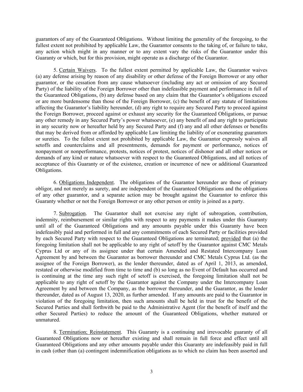 3 guarantors of any of the Guaranteed Obligations. Without limiting the generality of the foregoing, to the fullest extent not prohibited by applicable Law, the Guarantor consents to the taking of, or failure to take, any action which might in any manner or to any extent vary the risks of the Guarantor under this Guaranty or which, but for this provision, might operate as a discharge of the Guarantor. 5. Certain Waivers. To the fullest extent permitted by applicable Law, the Guarantor waives (a) any defense arising by reason of any disability or other defense of the Foreign Borrower or any other guarantor, or the cessation from any cause whatsoever (including any act or omission of any Secured Party) of the liability of the Foreign Borrower other than indefeasible payment and performance in full of the Guaranteed Obligations, (b) any defense based on any claim that the Guarantor’s obligations exceed or are more burdensome than those of the Foreign Borrower, (c) the benefit of any statute of limitations affecting the Guarantor’s liability hereunder, (d) any right to require any Secured Party to proceed against the Foreign Borrower, proceed against or exhaust any security for the Guaranteed Obligations, or pursue any other remedy in any Secured Party’s power whatsoever, (e) any benefit of and any right to participate in any security now or hereafter held by any Secured Party and (f) any and all other defenses or benefits that may be derived from or afforded by applicable Law limiting the liability of or exonerating guarantors or sureties. To the fullest extent not prohibited by applicable Law, the Guarantor expressly waives all setoffs and counterclaims and all presentments, demands for payment or performance, notices of nonpayment or nonperformance, protests, notices of protest, notices of dishonor and all other notices or demands of any kind or nature whatsoever with respect to the Guaranteed Obligations, and all notices of acceptance of this Guaranty or of the existence, creation or incurrence of new or additional Guaranteed Obligations. 6. Obligations Independent. The obligations of the Guarantor hereunder are those of primary obligor, and not merely as surety, and are independent of the Guaranteed Obligations and the obligations of any other guarantor, and a separate action may be brought against the Guarantor to enforce this Guaranty whether or not the Foreign Borrower or any other person or entity is joined as a party. 7. Subrogation. The Guarantor shall not exercise any right of subrogation, contribution, indemnity, reimbursement or similar rights with respect to any payments it makes under this Guaranty until all of the Guaranteed Obligations and any amounts payable under this Guaranty have been indefeasibly paid and performed in full and any commitments of each Secured Party or facilities provided by each Secured Party with respect to the Guaranteed Obligations are terminated; provided that (a) the foregoing limitation shall not be applicable to any right of setoff by the Guarantor against CMC Metals Cyprus Ltd or any of its assignee under that certain Amended and Restated Intercompany Loan Agreement by and between the Guarantor as borrower thereunder and CMC Metals Cyprus Ltd. (as the assignee of the Foreign Borrower), as the lender thereunder, dated as of April 1, 2013, as amended, restated or otherwise modified from time to time and (b) so long as no Event of Default has occurred and is continuing at the time any such right of setoff is exercised, the foregoing limitation shall not be applicable to any right of setoff by the Guarantor against the Company under the Intercompany Loan Agreement by and between the Company, as the borrower thereunder, and the Guarantor, as the lender thereunder, dated as of August 13, 2020, as further amended. If any amounts are paid to the Guarantor in violation of the foregoing limitation, then such amounts shall be held in trust for the benefit of the Secured Parties and shall forthwith be paid to the Administrative Agent (for the benefit of itself and the other Secured Parties) to reduce the amount of the Guaranteed Obligations, whether matured or unmatured. 8. Termination; Reinstatement. This Guaranty is a continuing and irrevocable guaranty of all Guaranteed Obligations now or hereafter existing and shall remain in full force and effect until all Guaranteed Obligations and any other amounts payable under this Guaranty are indefeasibly paid in full in cash (other than (a) contingent indemnification obligations as to which no claim has been asserted and