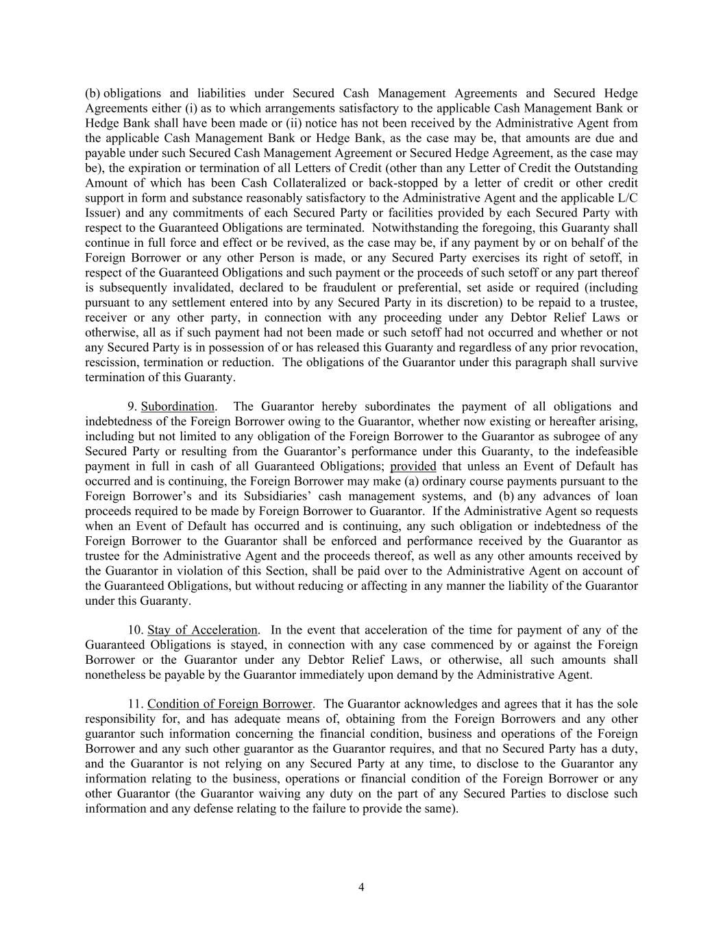 4 (b) obligations and liabilities under Secured Cash Management Agreements and Secured Hedge Agreements either (i) as to which arrangements satisfactory to the applicable Cash Management Bank or Hedge Bank shall have been made or (ii) notice has not been received by the Administrative Agent from the applicable Cash Management Bank or Hedge Bank, as the case may be, that amounts are due and payable under such Secured Cash Management Agreement or Secured Hedge Agreement, as the case may be), the expiration or termination of all Letters of Credit (other than any Letter of Credit the Outstanding Amount of which has been Cash Collateralized or back-stopped by a letter of credit or other credit support in form and substance reasonably satisfactory to the Administrative Agent and the applicable L/C Issuer) and any commitments of each Secured Party or facilities provided by each Secured Party with respect to the Guaranteed Obligations are terminated. Notwithstanding the foregoing, this Guaranty shall continue in full force and effect or be revived, as the case may be, if any payment by or on behalf of the Foreign Borrower or any other Person is made, or any Secured Party exercises its right of setoff, in respect of the Guaranteed Obligations and such payment or the proceeds of such setoff or any part thereof is subsequently invalidated, declared to be fraudulent or preferential, set aside or required (including pursuant to any settlement entered into by any Secured Party in its discretion) to be repaid to a trustee, receiver or any other party, in connection with any proceeding under any Debtor Relief Laws or otherwise, all as if such payment had not been made or such setoff had not occurred and whether or not any Secured Party is in possession of or has released this Guaranty and regardless of any prior revocation, rescission, termination or reduction. The obligations of the Guarantor under this paragraph shall survive termination of this Guaranty. 9. Subordination. The Guarantor hereby subordinates the payment of all obligations and indebtedness of the Foreign Borrower owing to the Guarantor, whether now existing or hereafter arising, including but not limited to any obligation of the Foreign Borrower to the Guarantor as subrogee of any Secured Party or resulting from the Guarantor’s performance under this Guaranty, to the indefeasible payment in full in cash of all Guaranteed Obligations; provided that unless an Event of Default has occurred and is continuing, the Foreign Borrower may make (a) ordinary course payments pursuant to the Foreign Borrower’s and its Subsidiaries’ cash management systems, and (b) any advances of loan proceeds required to be made by Foreign Borrower to Guarantor. If the Administrative Agent so requests when an Event of Default has occurred and is continuing, any such obligation or indebtedness of the Foreign Borrower to the Guarantor shall be enforced and performance received by the Guarantor as trustee for the Administrative Agent and the proceeds thereof, as well as any other amounts received by the Guarantor in violation of this Section, shall be paid over to the Administrative Agent on account of the Guaranteed Obligations, but without reducing or affecting in any manner the liability of the Guarantor under this Guaranty. 10. Stay of Acceleration. In the event that acceleration of the time for payment of any of the Guaranteed Obligations is stayed, in connection with any case commenced by or against the Foreign Borrower or the Guarantor under any Debtor Relief Laws, or otherwise, all such amounts shall nonetheless be payable by the Guarantor immediately upon demand by the Administrative Agent. 11. Condition of Foreign Borrower. The Guarantor acknowledges and agrees that it has the sole responsibility for, and has adequate means of, obtaining from the Foreign Borrowers and any other guarantor such information concerning the financial condition, business and operations of the Foreign Borrower and any such other guarantor as the Guarantor requires, and that no Secured Party has a duty, and the Guarantor is not relying on any Secured Party at any time, to disclose to the Guarantor any information relating to the business, operations or financial condition of the Foreign Borrower or any other Guarantor (the Guarantor waiving any duty on the part of any Secured Parties to disclose such information and any defense relating to the failure to provide the same).