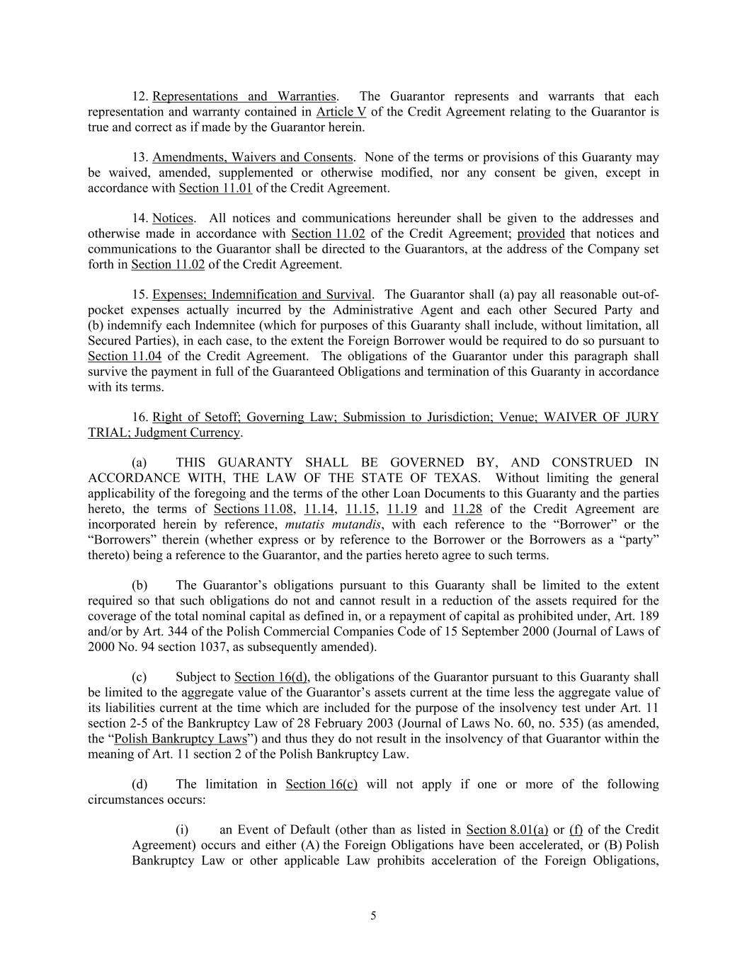 5 12. Representations and Warranties. The Guarantor represents and warrants that each representation and warranty contained in Article V of the Credit Agreement relating to the Guarantor is true and correct as if made by the Guarantor herein. 13. Amendments, Waivers and Consents. None of the terms or provisions of this Guaranty may be waived, amended, supplemented or otherwise modified, nor any consent be given, except in accordance with Section 11.01 of the Credit Agreement. 14. Notices. All notices and communications hereunder shall be given to the addresses and otherwise made in accordance with Section 11.02 of the Credit Agreement; provided that notices and communications to the Guarantor shall be directed to the Guarantors, at the address of the Company set forth in Section 11.02 of the Credit Agreement. 15. Expenses; Indemnification and Survival. The Guarantor shall (a) pay all reasonable out-of- pocket expenses actually incurred by the Administrative Agent and each other Secured Party and (b) indemnify each Indemnitee (which for purposes of this Guaranty shall include, without limitation, all Secured Parties), in each case, to the extent the Foreign Borrower would be required to do so pursuant to Section 11.04 of the Credit Agreement. The obligations of the Guarantor under this paragraph shall survive the payment in full of the Guaranteed Obligations and termination of this Guaranty in accordance with its terms. 16. Right of Setoff; Governing Law; Submission to Jurisdiction; Venue; WAIVER OF JURY TRIAL; Judgment Currency. (a) THIS GUARANTY SHALL BE GOVERNED BY, AND CONSTRUED IN ACCORDANCE WITH, THE LAW OF THE STATE OF TEXAS. Without limiting the general applicability of the foregoing and the terms of the other Loan Documents to this Guaranty and the parties hereto, the terms of Sections 11.08, 11.14, 11.15, 11.19 and 11.28 of the Credit Agreement are incorporated herein by reference, mutatis mutandis, with each reference to the “Borrower” or the “Borrowers” therein (whether express or by reference to the Borrower or the Borrowers as a “party” thereto) being a reference to the Guarantor, and the parties hereto agree to such terms. (b) The Guarantor’s obligations pursuant to this Guaranty shall be limited to the extent required so that such obligations do not and cannot result in a reduction of the assets required for the coverage of the total nominal capital as defined in, or a repayment of capital as prohibited under, Art. 189 and/or by Art. 344 of the Polish Commercial Companies Code of 15 September 2000 (Journal of Laws of 2000 No. 94 section 1037, as subsequently amended). (c) Subject to Section 16(d), the obligations of the Guarantor pursuant to this Guaranty shall be limited to the aggregate value of the Guarantor’s assets current at the time less the aggregate value of its liabilities current at the time which are included for the purpose of the insolvency test under Art. 11 section 2-5 of the Bankruptcy Law of 28 February 2003 (Journal of Laws No. 60, no. 535) (as amended, the “Polish Bankruptcy Laws”) and thus they do not result in the insolvency of that Guarantor within the meaning of Art. 11 section 2 of the Polish Bankruptcy Law. (d) The limitation in Section 16(c) will not apply if one or more of the following circumstances occurs: (i) an Event of Default (other than as listed in Section 8.01(a) or (f) of the Credit Agreement) occurs and either (A) the Foreign Obligations have been accelerated, or (B) Polish Bankruptcy Law or other applicable Law prohibits acceleration of the Foreign Obligations,