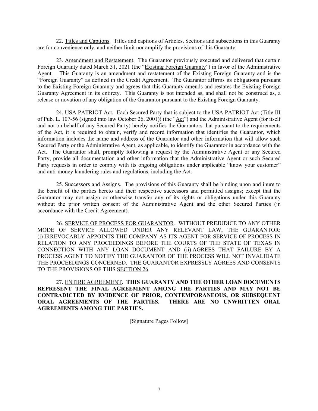 7 22. Titles and Captions. Titles and captions of Articles, Sections and subsections in this Guaranty are for convenience only, and neither limit nor amplify the provisions of this Guaranty. 23. Amendment and Restatement. The Guarantor previously executed and delivered that certain Foreign Guaranty dated March 31, 2021 (the “Existing Foreign Guaranty”) in favor of the Administrative Agent. This Guaranty is an amendment and restatement of the Existing Foreign Guaranty and is the “Foreign Guaranty” as defined in the Credit Agreement. The Guarantor affirms its obligations pursuant to the Existing Foreign Guaranty and agrees that this Guaranty amends and restates the Existing Foreign Guaranty Agreement in its entirety. This Guaranty is not intended as, and shall not be construed as, a release or novation of any obligation of the Guarantor pursuant to the Existing Foreign Guaranty. 24. USA PATRIOT Act. Each Secured Party that is subject to the USA PATRIOT Act (Title III of Pub. L. 107-56 (signed into law October 26, 2001)) (the “Act”) and the Administrative Agent (for itself and not on behalf of any Secured Party) hereby notifies the Guarantors that pursuant to the requirements of the Act, it is required to obtain, verify and record information that identifies the Guarantor, which information includes the name and address of the Guarantor and other information that will allow such Secured Party or the Administrative Agent, as applicable, to identify the Guarantor in accordance with the Act. The Guarantor shall, promptly following a request by the Administrative Agent or any Secured Party, provide all documentation and other information that the Administrative Agent or such Secured Party requests in order to comply with its ongoing obligations under applicable “know your customer” and anti-money laundering rules and regulations, including the Act. 25. Successors and Assigns. The provisions of this Guaranty shall be binding upon and inure to the benefit of the parties hereto and their respective successors and permitted assigns; except that the Guarantor may not assign or otherwise transfer any of its rights or obligations under this Guaranty without the prior written consent of the Administrative Agent and the other Secured Parties (in accordance with the Credit Agreement). 26. SERVICE OF PROCESS FOR GUARANTOR. WITHOUT PREJUDICE TO ANY OTHER MODE OF SERVICE ALLOWED UNDER ANY RELEVANT LAW, THE GUARANTOR: (i) IRREVOCABLY APPOINTS THE COMPANY AS ITS AGENT FOR SERVICE OF PROCESS IN RELATION TO ANY PROCEEDINGS BEFORE THE COURTS OF THE STATE OF TEXAS IN CONNECTION WITH ANY LOAN DOCUMENT AND (ii) AGREES THAT FAILURE BY A PROCESS AGENT TO NOTIFY THE GUARANTOR OF THE PROCESS WILL NOT INVALIDATE THE PROCEEDINGS CONCERNED. THE GUARANTOR EXPRESSLY AGREES AND CONSENTS TO THE PROVISIONS OF THIS SECTION 26. 27. ENTIRE AGREEMENT. THIS GUARANTY AND THE OTHER LOAN DOCUMENTS REPRESENT THE FINAL AGREEMENT AMONG THE PARTIES AND MAY NOT BE CONTRADICTED BY EVIDENCE OF PRIOR, CONTEMPORANEOUS, OR SUBSEQUENT ORAL AGREEMENTS OF THE PARTIES. THERE ARE NO UNWRITTEN ORAL AGREEMENTS AMONG THE PARTIES. [Signature Pages Follow]