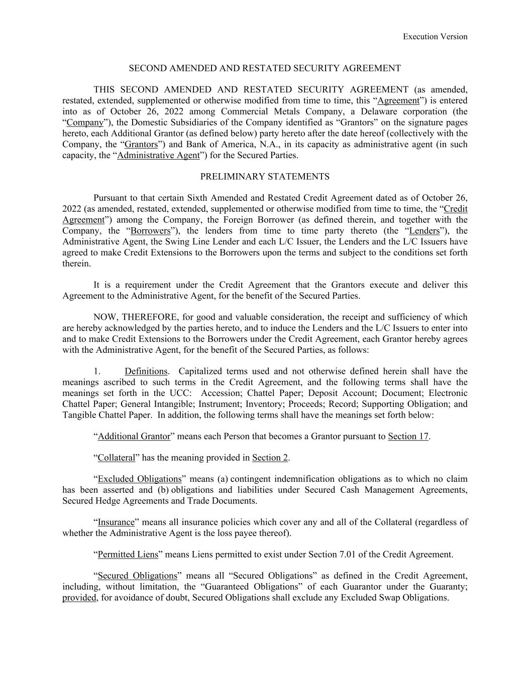 Execution Version SECOND AMENDED AND RESTATED SECURITY AGREEMENT THIS SECOND AMENDED AND RESTATED SECURITY AGREEMENT (as amended, restated, extended, supplemented or otherwise modified from time to time, this “Agreement”) is entered into as of October 26, 2022 among Commercial Metals Company, a Delaware corporation (the “Company”), the Domestic Subsidiaries of the Company identified as “Grantors” on the signature pages hereto, each Additional Grantor (as defined below) party hereto after the date hereof (collectively with the Company, the “Grantors”) and Bank of America, N.A., in its capacity as administrative agent (in such capacity, the “Administrative Agent”) for the Secured Parties. PRELIMINARY STATEMENTS Pursuant to that certain Sixth Amended and Restated Credit Agreement dated as of October 26, 2022 (as amended, restated, extended, supplemented or otherwise modified from time to time, the “Credit Agreement”) among the Company, the Foreign Borrower (as defined therein, and together with the Company, the “Borrowers”), the lenders from time to time party thereto (the “Lenders”), the Administrative Agent, the Swing Line Lender and each L/C Issuer, the Lenders and the L/C Issuers have agreed to make Credit Extensions to the Borrowers upon the terms and subject to the conditions set forth therein. It is a requirement under the Credit Agreement that the Grantors execute and deliver this Agreement to the Administrative Agent, for the benefit of the Secured Parties. NOW, THEREFORE, for good and valuable consideration, the receipt and sufficiency of which are hereby acknowledged by the parties hereto, and to induce the Lenders and the L/C Issuers to enter into and to make Credit Extensions to the Borrowers under the Credit Agreement, each Grantor hereby agrees with the Administrative Agent, for the benefit of the Secured Parties, as follows: 1. Definitions. Capitalized terms used and not otherwise defined herein shall have the meanings ascribed to such terms in the Credit Agreement, and the following terms shall have the meanings set forth in the UCC: Accession; Chattel Paper; Deposit Account; Document; Electronic Chattel Paper; General Intangible; Instrument; Inventory; Proceeds; Record; Supporting Obligation; and Tangible Chattel Paper. In addition, the following terms shall have the meanings set forth below: “Additional Grantor” means each Person that becomes a Grantor pursuant to Section 17. “Collateral” has the meaning provided in Section 2. “Excluded Obligations” means (a) contingent indemnification obligations as to which no claim has been asserted and (b) obligations and liabilities under Secured Cash Management Agreements, Secured Hedge Agreements and Trade Documents. “Insurance” means all insurance policies which cover any and all of the Collateral (regardless of whether the Administrative Agent is the loss payee thereof). “Permitted Liens” means Liens permitted to exist under Section 7.01 of the Credit Agreement. “Secured Obligations” means all “Secured Obligations” as defined in the Credit Agreement, including, without limitation, the “Guaranteed Obligations” of each Guarantor under the Guaranty; provided, for avoidance of doubt, Secured Obligations shall exclude any Excluded Swap Obligations.