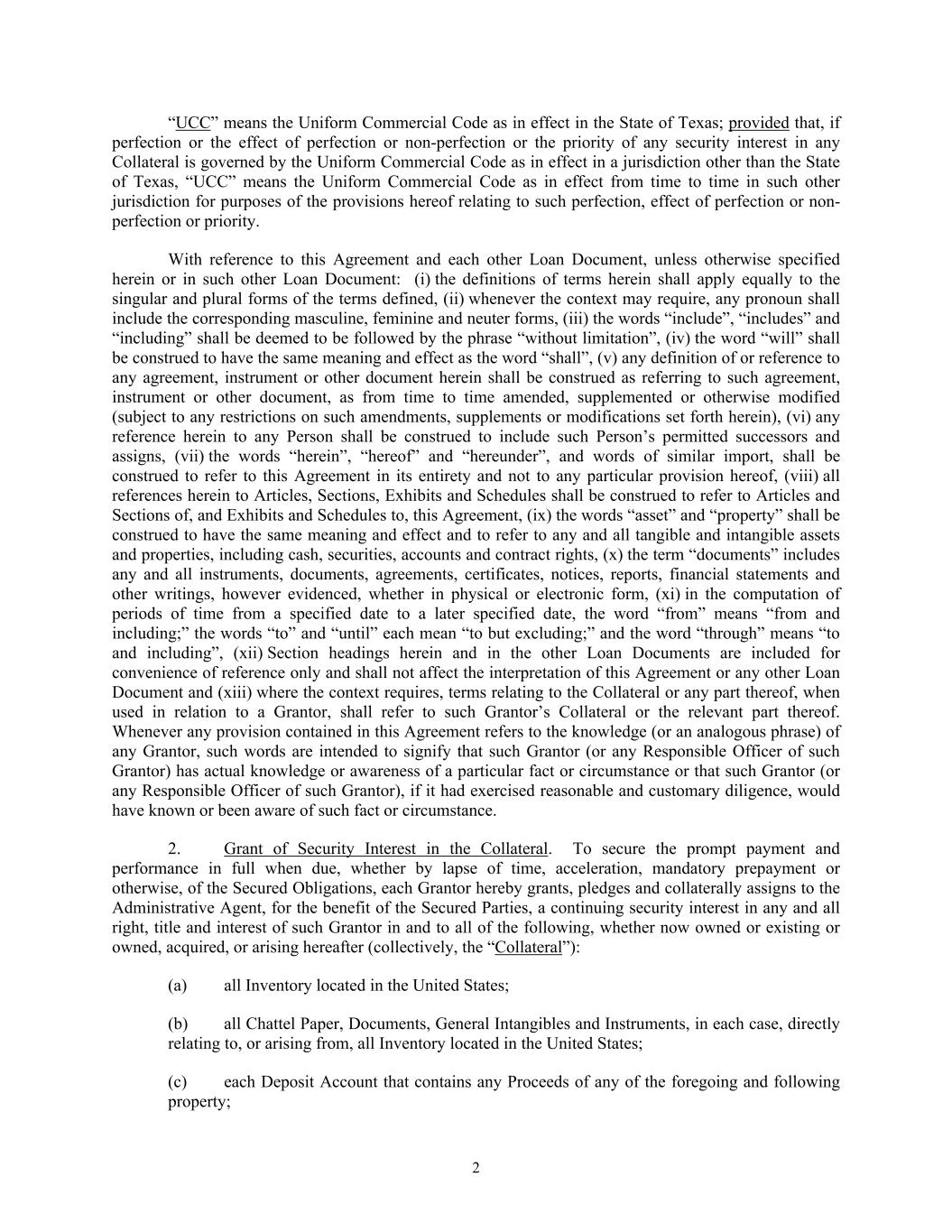2 “UCC” means the Uniform Commercial Code as in effect in the State of Texas; provided that, if perfection or the effect of perfection or non-perfection or the priority of any security interest in any Collateral is governed by the Uniform Commercial Code as in effect in a jurisdiction other than the State of Texas, “UCC” means the Uniform Commercial Code as in effect from time to time in such other jurisdiction for purposes of the provisions hereof relating to such perfection, effect of perfection or non- perfection or priority. With reference to this Agreement and each other Loan Document, unless otherwise specified herein or in such other Loan Document: (i) the definitions of terms herein shall apply equally to the singular and plural forms of the terms defined, (ii) whenever the context may require, any pronoun shall include the corresponding masculine, feminine and neuter forms, (iii) the words “include”, “includes” and “including” shall be deemed to be followed by the phrase “without limitation”, (iv) the word “will” shall be construed to have the same meaning and effect as the word “shall”, (v) any definition of or reference to any agreement, instrument or other document herein shall be construed as referring to such agreement, instrument or other document, as from time to time amended, supplemented or otherwise modified (subject to any restrictions on such amendments, supplements or modifications set forth herein), (vi) any reference herein to any Person shall be construed to include such Person’s permitted successors and assigns, (vii) the words “herein”, “hereof” and “hereunder”, and words of similar import, shall be construed to refer to this Agreement in its entirety and not to any particular provision hereof, (viii) all references herein to Articles, Sections, Exhibits and Schedules shall be construed to refer to Articles and Sections of, and Exhibits and Schedules to, this Agreement, (ix) the words “asset” and “property” shall be construed to have the same meaning and effect and to refer to any and all tangible and intangible assets and properties, including cash, securities, accounts and contract rights, (x) the term “documents” includes any and all instruments, documents, agreements, certificates, notices, reports, financial statements and other writings, however evidenced, whether in physical or electronic form, (xi) in the computation of periods of time from a specified date to a later specified date, the word “from” means “from and including;” the words “to” and “until” each mean “to but excluding;” and the word “through” means “to and including”, (xii) Section headings herein and in the other Loan Documents are included for convenience of reference only and shall not affect the interpretation of this Agreement or any other Loan Document and (xiii) where the context requires, terms relating to the Collateral or any part thereof, when used in relation to a Grantor, shall refer to such Grantor’s Collateral or the relevant part thereof. Whenever any provision contained in this Agreement refers to the knowledge (or an analogous phrase) of any Grantor, such words are intended to signify that such Grantor (or any Responsible Officer of such Grantor) has actual knowledge or awareness of a particular fact or circumstance or that such Grantor (or any Responsible Officer of such Grantor), if it had exercised reasonable and customary diligence, would have known or been aware of such fact or circumstance. 2. Grant of Security Interest in the Collateral. To secure the prompt payment and performance in full when due, whether by lapse of time, acceleration, mandatory prepayment or otherwise, of the Secured Obligations, each Grantor hereby grants, pledges and collaterally assigns to the Administrative Agent, for the benefit of the Secured Parties, a continuing security interest in any and all right, title and interest of such Grantor in and to all of the following, whether now owned or existing or owned, acquired, or arising hereafter (collectively, the “Collateral”): (a) all Inventory located in the United States; (b) all Chattel Paper, Documents, General Intangibles and Instruments, in each case, directly relating to, or arising from, all Inventory located in the United States; (c) each Deposit Account that contains any Proceeds of any of the foregoing and following property;