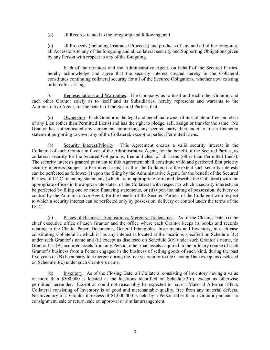 3 (d) all Records related to the foregoing and following; and (e) all Proceeds (including Insurance Proceeds) and products of any and all of the foregoing, all Accessions to any of the foregoing and all collateral security and Supporting Obligations given by any Person with respect to any of the foregoing. Each of the Grantors and the Administrative Agent, on behalf of the Secured Parties, hereby acknowledge and agree that the security interest created hereby in the Collateral constitutes continuing collateral security for all of the Secured Obligations, whether now existing or hereafter arising. 3. Representations and Warranties. The Company, as to itself and each other Grantor, and each other Grantor solely as to itself and its Subsidiaries, hereby represents and warrants to the Administrative Agent, for the benefit of the Secured Parties, that: (a) Ownership. Each Grantor is the legal and beneficial owner of its Collateral free and clear of any Lien (other than Permitted Liens) and has the right to pledge, sell, assign or transfer the same. No Grantor has authenticated any agreement authorizing any secured party thereunder to file a financing statement purporting to cover any of the Collateral, except to perfect Permitted Liens. (b) Security Interest/Priority. This Agreement creates a valid security interest in the Collateral of such Grantor in favor of the Administrative Agent, for the benefit of the Secured Parties, as collateral security for the Secured Obligations, free and clear of all Liens (other than Permitted Liens). The security interests granted pursuant to this Agreement shall constitute valid and perfected first priority security interests (subject to Permitted Liens) in all of the Collateral to the extent such security interests can be perfected as follows: (i) upon the filing by the Administrative Agent, for the benefit of the Secured Parties, of UCC financing statements (which are in appropriate form and describe the Collateral) with the appropriate offices in the appropriate states, of the Collateral with respect to which a security interest can be perfected by filing one or more financing statements, or (ii) upon the taking of possession, delivery or control by the Administrative Agent, for the benefit of the Secured Parties, of the Collateral with respect to which a security interest can be perfected only by possession, delivery or control under the terms of the UCC. (c) Places of Business; Acquisitions; Mergers; Tradenames. As of the Closing Date, (i) the chief executive office of each Grantor and the office where each Grantor keeps its books and records relating to the Chattel Paper, Documents, General Intangibles, Instruments and Inventory, in each case constituting Collateral in which it has any interest is located at the locations specified on Schedule 3(c) under such Grantor’s name and (ii) except as disclosed on Schedule 3(c) under such Grantor’s name, no Grantor has (A) acquired assets from any Person, other than assets acquired in the ordinary course of such Grantor’s business from a Person engaged in the business of selling goods of such kind, during the past five years or (B) been party to a merger during the five years prior to the Closing Date except as disclosed on Schedule 3(c) under such Grantor’s name. (d) Inventory. As of the Closing Date, all Collateral consisting of Inventory having a value of more than $500,000 is located at the locations identified on Schedule 3(d), except as otherwise permitted hereunder. Except as could not reasonably be expected to have a Material Adverse Effect, Collateral consisting of Inventory is of good and merchantable quality, free from any material defects. No Inventory of a Grantor in excess of $1,000,000 is held by a Person other than a Grantor pursuant to consignment, sale or return, sale on approval or similar arrangement.