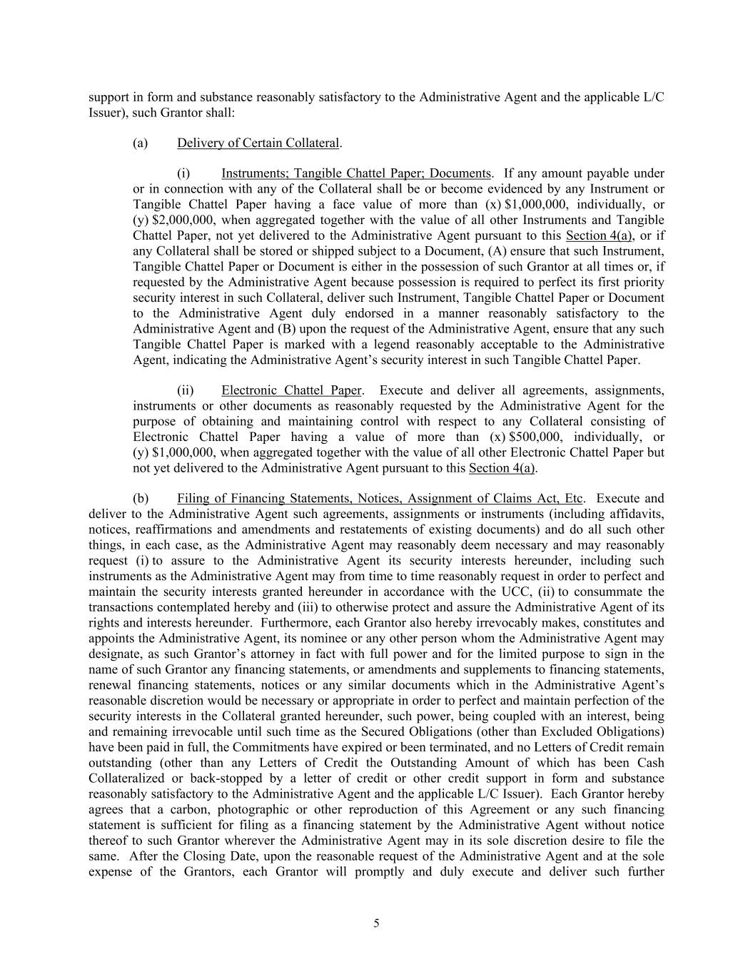 5 support in form and substance reasonably satisfactory to the Administrative Agent and the applicable L/C Issuer), such Grantor shall: (a) Delivery of Certain Collateral. (i) Instruments; Tangible Chattel Paper; Documents. If any amount payable under or in connection with any of the Collateral shall be or become evidenced by any Instrument or Tangible Chattel Paper having a face value of more than (x) $1,000,000, individually, or (y) $2,000,000, when aggregated together with the value of all other Instruments and Tangible Chattel Paper, not yet delivered to the Administrative Agent pursuant to this Section 4(a), or if any Collateral shall be stored or shipped subject to a Document, (A) ensure that such Instrument, Tangible Chattel Paper or Document is either in the possession of such Grantor at all times or, if requested by the Administrative Agent because possession is required to perfect its first priority security interest in such Collateral, deliver such Instrument, Tangible Chattel Paper or Document to the Administrative Agent duly endorsed in a manner reasonably satisfactory to the Administrative Agent and (B) upon the request of the Administrative Agent, ensure that any such Tangible Chattel Paper is marked with a legend reasonably acceptable to the Administrative Agent, indicating the Administrative Agent’s security interest in such Tangible Chattel Paper. (ii) Electronic Chattel Paper. Execute and deliver all agreements, assignments, instruments or other documents as reasonably requested by the Administrative Agent for the purpose of obtaining and maintaining control with respect to any Collateral consisting of Electronic Chattel Paper having a value of more than (x) $500,000, individually, or (y) $1,000,000, when aggregated together with the value of all other Electronic Chattel Paper but not yet delivered to the Administrative Agent pursuant to this Section 4(a). (b) Filing of Financing Statements, Notices, Assignment of Claims Act, Etc. Execute and deliver to the Administrative Agent such agreements, assignments or instruments (including affidavits, notices, reaffirmations and amendments and restatements of existing documents) and do all such other things, in each case, as the Administrative Agent may reasonably deem necessary and may reasonably request (i) to assure to the Administrative Agent its security interests hereunder, including such instruments as the Administrative Agent may from time to time reasonably request in order to perfect and maintain the security interests granted hereunder in accordance with the UCC, (ii) to consummate the transactions contemplated hereby and (iii) to otherwise protect and assure the Administrative Agent of its rights and interests hereunder. Furthermore, each Grantor also hereby irrevocably makes, constitutes and appoints the Administrative Agent, its nominee or any other person whom the Administrative Agent may designate, as such Grantor’s attorney in fact with full power and for the limited purpose to sign in the name of such Grantor any financing statements, or amendments and supplements to financing statements, renewal financing statements, notices or any similar documents which in the Administrative Agent’s reasonable discretion would be necessary or appropriate in order to perfect and maintain perfection of the security interests in the Collateral granted hereunder, such power, being coupled with an interest, being and remaining irrevocable until such time as the Secured Obligations (other than Excluded Obligations) have been paid in full, the Commitments have expired or been terminated, and no Letters of Credit remain outstanding (other than any Letters of Credit the Outstanding Amount of which has been Cash Collateralized or back-stopped by a letter of credit or other credit support in form and substance reasonably satisfactory to the Administrative Agent and the applicable L/C Issuer). Each Grantor hereby agrees that a carbon, photographic or other reproduction of this Agreement or any such financing statement is sufficient for filing as a financing statement by the Administrative Agent without notice thereof to such Grantor wherever the Administrative Agent may in its sole discretion desire to file the same. After the Closing Date, upon the reasonable request of the Administrative Agent and at the sole expense of the Grantors, each Grantor will promptly and duly execute and deliver such further