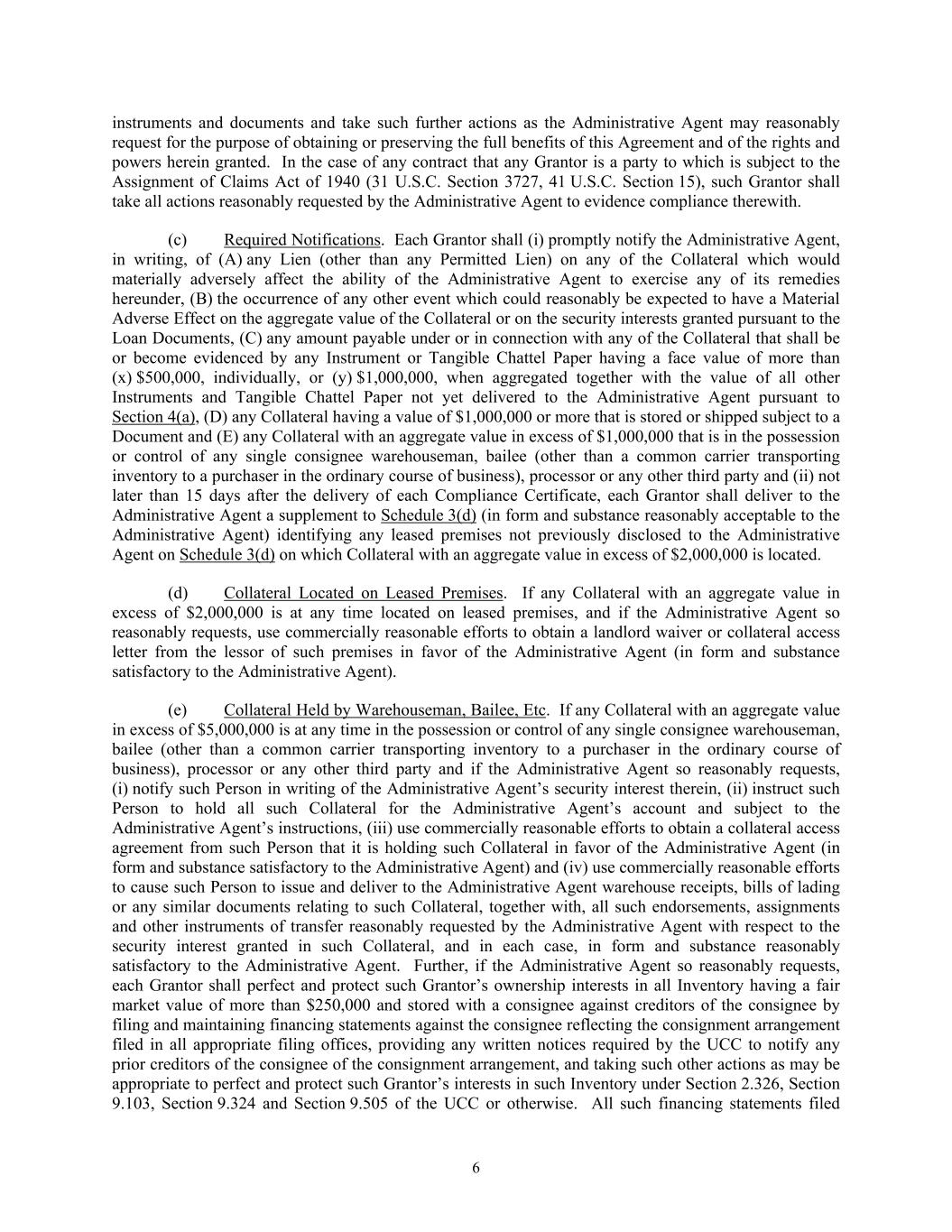 6 instruments and documents and take such further actions as the Administrative Agent may reasonably request for the purpose of obtaining or preserving the full benefits of this Agreement and of the rights and powers herein granted. In the case of any contract that any Grantor is a party to which is subject to the Assignment of Claims Act of 1940 (31 U.S.C. Section 3727, 41 U.S.C. Section 15), such Grantor shall take all actions reasonably requested by the Administrative Agent to evidence compliance therewith. (c) Required Notifications. Each Grantor shall (i) promptly notify the Administrative Agent, in writing, of (A) any Lien (other than any Permitted Lien) on any of the Collateral which would materially adversely affect the ability of the Administrative Agent to exercise any of its remedies hereunder, (B) the occurrence of any other event which could reasonably be expected to have a Material Adverse Effect on the aggregate value of the Collateral or on the security interests granted pursuant to the Loan Documents, (C) any amount payable under or in connection with any of the Collateral that shall be or become evidenced by any Instrument or Tangible Chattel Paper having a face value of more than (x) $500,000, individually, or (y) $1,000,000, when aggregated together with the value of all other Instruments and Tangible Chattel Paper not yet delivered to the Administrative Agent pursuant to Section 4(a), (D) any Collateral having a value of $1,000,000 or more that is stored or shipped subject to a Document and (E) any Collateral with an aggregate value in excess of $1,000,000 that is in the possession or control of any single consignee warehouseman, bailee (other than a common carrier transporting inventory to a purchaser in the ordinary course of business), processor or any other third party and (ii) not later than 15 days after the delivery of each Compliance Certificate, each Grantor shall deliver to the Administrative Agent a supplement to Schedule 3(d) (in form and substance reasonably acceptable to the Administrative Agent) identifying any leased premises not previously disclosed to the Administrative Agent on Schedule 3(d) on which Collateral with an aggregate value in excess of $2,000,000 is located. (d) Collateral Located on Leased Premises. If any Collateral with an aggregate value in excess of $2,000,000 is at any time located on leased premises, and if the Administrative Agent so reasonably requests, use commercially reasonable efforts to obtain a landlord waiver or collateral access letter from the lessor of such premises in favor of the Administrative Agent (in form and substance satisfactory to the Administrative Agent). (e) Collateral Held by Warehouseman, Bailee, Etc. If any Collateral with an aggregate value in excess of $5,000,000 is at any time in the possession or control of any single consignee warehouseman, bailee (other than a common carrier transporting inventory to a purchaser in the ordinary course of business), processor or any other third party and if the Administrative Agent so reasonably requests, (i) notify such Person in writing of the Administrative Agent’s security interest therein, (ii) instruct such Person to hold all such Collateral for the Administrative Agent’s account and subject to the Administrative Agent’s instructions, (iii) use commercially reasonable efforts to obtain a collateral access agreement from such Person that it is holding such Collateral in favor of the Administrative Agent (in form and substance satisfactory to the Administrative Agent) and (iv) use commercially reasonable efforts to cause such Person to issue and deliver to the Administrative Agent warehouse receipts, bills of lading or any similar documents relating to such Collateral, together with, all such endorsements, assignments and other instruments of transfer reasonably requested by the Administrative Agent with respect to the security interest granted in such Collateral, and in each case, in form and substance reasonably satisfactory to the Administrative Agent. Further, if the Administrative Agent so reasonably requests, each Grantor shall perfect and protect such Grantor’s ownership interests in all Inventory having a fair market value of more than $250,000 and stored with a consignee against creditors of the consignee by filing and maintaining financing statements against the consignee reflecting the consignment arrangement filed in all appropriate filing offices, providing any written notices required by the UCC to notify any prior creditors of the consignee of the consignment arrangement, and taking such other actions as may be appropriate to perfect and protect such Grantor’s interests in such Inventory under Section 2.326, Section 9.103, Section 9.324 and Section 9.505 of the UCC or otherwise. All such financing statements filed
