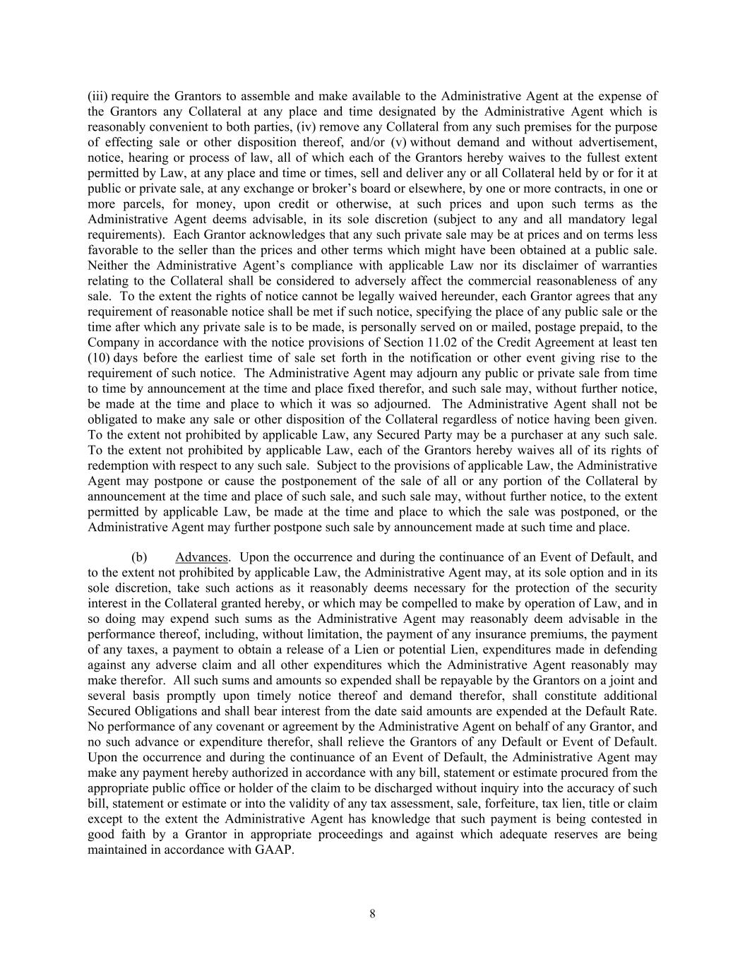 8 (iii) require the Grantors to assemble and make available to the Administrative Agent at the expense of the Grantors any Collateral at any place and time designated by the Administrative Agent which is reasonably convenient to both parties, (iv) remove any Collateral from any such premises for the purpose of effecting sale or other disposition thereof, and/or (v) without demand and without advertisement, notice, hearing or process of law, all of which each of the Grantors hereby waives to the fullest extent permitted by Law, at any place and time or times, sell and deliver any or all Collateral held by or for it at public or private sale, at any exchange or broker’s board or elsewhere, by one or more contracts, in one or more parcels, for money, upon credit or otherwise, at such prices and upon such terms as the Administrative Agent deems advisable, in its sole discretion (subject to any and all mandatory legal requirements). Each Grantor acknowledges that any such private sale may be at prices and on terms less favorable to the seller than the prices and other terms which might have been obtained at a public sale. Neither the Administrative Agent’s compliance with applicable Law nor its disclaimer of warranties relating to the Collateral shall be considered to adversely affect the commercial reasonableness of any sale. To the extent the rights of notice cannot be legally waived hereunder, each Grantor agrees that any requirement of reasonable notice shall be met if such notice, specifying the place of any public sale or the time after which any private sale is to be made, is personally served on or mailed, postage prepaid, to the Company in accordance with the notice provisions of Section 11.02 of the Credit Agreement at least ten (10) days before the earliest time of sale set forth in the notification or other event giving rise to the requirement of such notice. The Administrative Agent may adjourn any public or private sale from time to time by announcement at the time and place fixed therefor, and such sale may, without further notice, be made at the time and place to which it was so adjourned. The Administrative Agent shall not be obligated to make any sale or other disposition of the Collateral regardless of notice having been given. To the extent not prohibited by applicable Law, any Secured Party may be a purchaser at any such sale. To the extent not prohibited by applicable Law, each of the Grantors hereby waives all of its rights of redemption with respect to any such sale. Subject to the provisions of applicable Law, the Administrative Agent may postpone or cause the postponement of the sale of all or any portion of the Collateral by announcement at the time and place of such sale, and such sale may, without further notice, to the extent permitted by applicable Law, be made at the time and place to which the sale was postponed, or the Administrative Agent may further postpone such sale by announcement made at such time and place. (b) Advances. Upon the occurrence and during the continuance of an Event of Default, and to the extent not prohibited by applicable Law, the Administrative Agent may, at its sole option and in its sole discretion, take such actions as it reasonably deems necessary for the protection of the security interest in the Collateral granted hereby, or which may be compelled to make by operation of Law, and in so doing may expend such sums as the Administrative Agent may reasonably deem advisable in the performance thereof, including, without limitation, the payment of any insurance premiums, the payment of any taxes, a payment to obtain a release of a Lien or potential Lien, expenditures made in defending against any adverse claim and all other expenditures which the Administrative Agent reasonably may make therefor. All such sums and amounts so expended shall be repayable by the Grantors on a joint and several basis promptly upon timely notice thereof and demand therefor, shall constitute additional Secured Obligations and shall bear interest from the date said amounts are expended at the Default Rate. No performance of any covenant or agreement by the Administrative Agent on behalf of any Grantor, and no such advance or expenditure therefor, shall relieve the Grantors of any Default or Event of Default. Upon the occurrence and during the continuance of an Event of Default, the Administrative Agent may make any payment hereby authorized in accordance with any bill, statement or estimate procured from the appropriate public office or holder of the claim to be discharged without inquiry into the accuracy of such bill, statement or estimate or into the validity of any tax assessment, sale, forfeiture, tax lien, title or claim except to the extent the Administrative Agent has knowledge that such payment is being contested in good faith by a Grantor in appropriate proceedings and against which adequate reserves are being maintained in accordance with GAAP.
