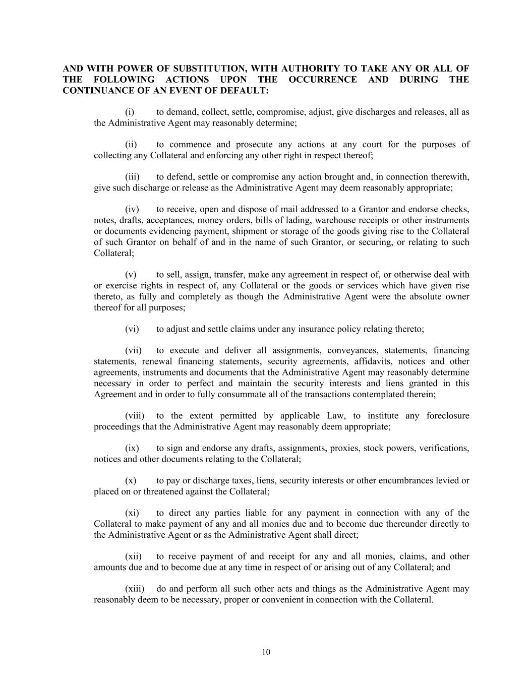 10 AND WITH POWER OF SUBSTITUTION, WITH AUTHORITY TO TAKE ANY OR ALL OF THE FOLLOWING ACTIONS UPON THE OCCURRENCE AND DURING THE CONTINUANCE OF AN EVENT OF DEFAULT: (i) to demand, collect, settle, compromise, adjust, give discharges and releases, all as the Administrative Agent may reasonably determine; (ii) to commence and prosecute any actions at any court for the purposes of collecting any Collateral and enforcing any other right in respect thereof; (iii) to defend, settle or compromise any action brought and, in connection therewith, give such discharge or release as the Administrative Agent may deem reasonably appropriate; (iv) to receive, open and dispose of mail addressed to a Grantor and endorse checks, notes, drafts, acceptances, money orders, bills of lading, warehouse receipts or other instruments or documents evidencing payment, shipment or storage of the goods giving rise to the Collateral of such Grantor on behalf of and in the name of such Grantor, or securing, or relating to such Collateral; (v) to sell, assign, transfer, make any agreement in respect of, or otherwise deal with or exercise rights in respect of, any Collateral or the goods or services which have given rise thereto, as fully and completely as though the Administrative Agent were the absolute owner thereof for all purposes; (vi) to adjust and settle claims under any insurance policy relating thereto; (vii) to execute and deliver all assignments, conveyances, statements, financing statements, renewal financing statements, security agreements, affidavits, notices and other agreements, instruments and documents that the Administrative Agent may reasonably determine necessary in order to perfect and maintain the security interests and liens granted in this Agreement and in order to fully consummate all of the transactions contemplated therein; (viii) to the extent permitted by applicable Law, to institute any foreclosure proceedings that the Administrative Agent may reasonably deem appropriate; (ix) to sign and endorse any drafts, assignments, proxies, stock powers, verifications, notices and other documents relating to the Collateral; (x) to pay or discharge taxes, liens, security interests or other encumbrances levied or placed on or threatened against the Collateral; (xi) to direct any parties liable for any payment in connection with any of the Collateral to make payment of any and all monies due and to become due thereunder directly to the Administrative Agent or as the Administrative Agent shall direct; (xii) to receive payment of and receipt for any and all monies, claims, and other amounts due and to become due at any time in respect of or arising out of any Collateral; and (xiii) do and perform all such other acts and things as the Administrative Agent may reasonably deem to be necessary, proper or convenient in connection with the Collateral.