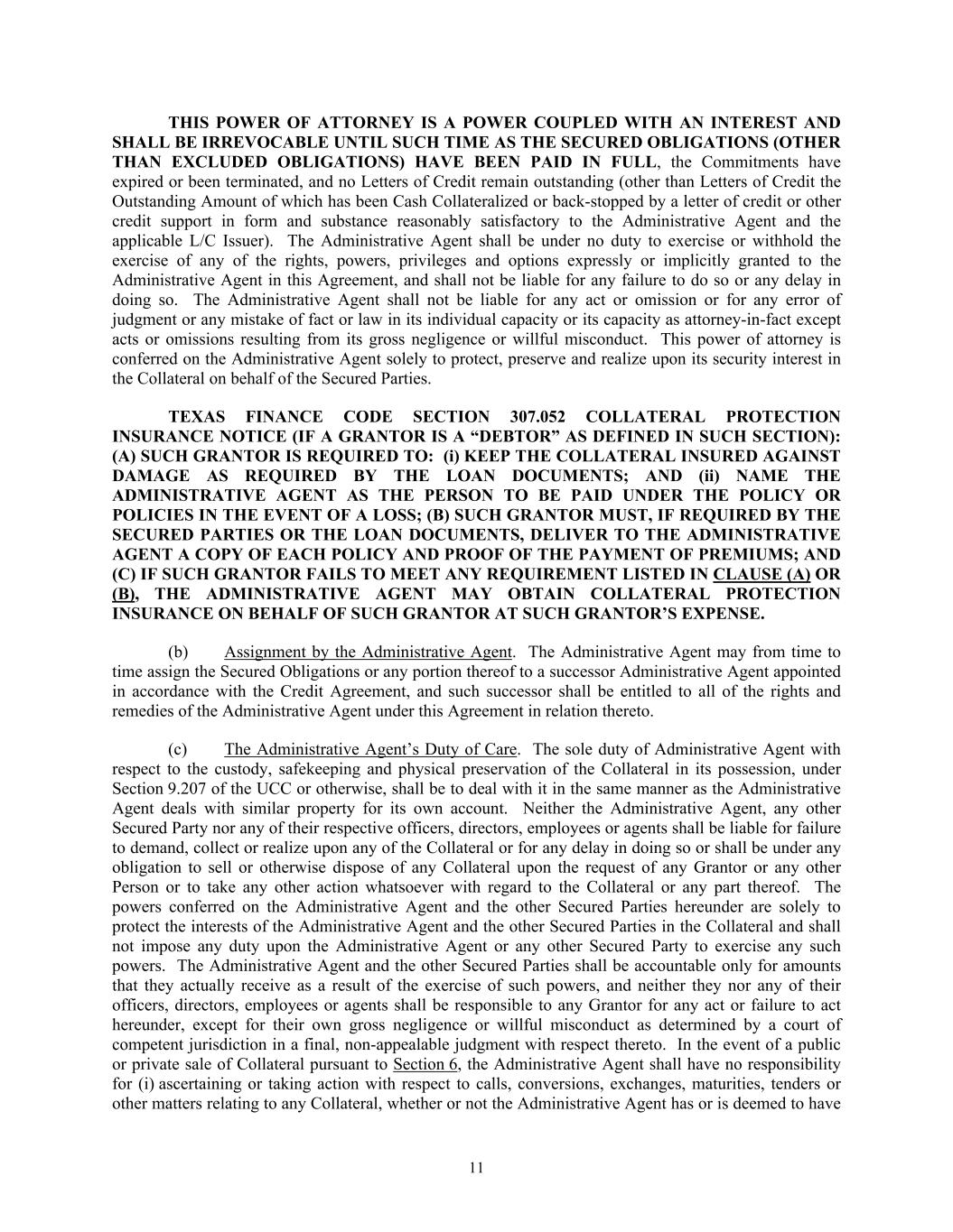 11 THIS POWER OF ATTORNEY IS A POWER COUPLED WITH AN INTEREST AND SHALL BE IRREVOCABLE UNTIL SUCH TIME AS THE SECURED OBLIGATIONS (OTHER THAN EXCLUDED OBLIGATIONS) HAVE BEEN PAID IN FULL, the Commitments have expired or been terminated, and no Letters of Credit remain outstanding (other than Letters of Credit the Outstanding Amount of which has been Cash Collateralized or back-stopped by a letter of credit or other credit support in form and substance reasonably satisfactory to the Administrative Agent and the applicable L/C Issuer). The Administrative Agent shall be under no duty to exercise or withhold the exercise of any of the rights, powers, privileges and options expressly or implicitly granted to the Administrative Agent in this Agreement, and shall not be liable for any failure to do so or any delay in doing so. The Administrative Agent shall not be liable for any act or omission or for any error of judgment or any mistake of fact or law in its individual capacity or its capacity as attorney-in-fact except acts or omissions resulting from its gross negligence or willful misconduct. This power of attorney is conferred on the Administrative Agent solely to protect, preserve and realize upon its security interest in the Collateral on behalf of the Secured Parties. TEXAS FINANCE CODE SECTION 307.052 COLLATERAL PROTECTION INSURANCE NOTICE (IF A GRANTOR IS A “DEBTOR” AS DEFINED IN SUCH SECTION): (A) SUCH GRANTOR IS REQUIRED TO: (i) KEEP THE COLLATERAL INSURED AGAINST DAMAGE AS REQUIRED BY THE LOAN DOCUMENTS; AND (ii) NAME THE ADMINISTRATIVE AGENT AS THE PERSON TO BE PAID UNDER THE POLICY OR POLICIES IN THE EVENT OF A LOSS; (B) SUCH GRANTOR MUST, IF REQUIRED BY THE SECURED PARTIES OR THE LOAN DOCUMENTS, DELIVER TO THE ADMINISTRATIVE AGENT A COPY OF EACH POLICY AND PROOF OF THE PAYMENT OF PREMIUMS; AND (C) IF SUCH GRANTOR FAILS TO MEET ANY REQUIREMENT LISTED IN CLAUSE (A) OR (B), THE ADMINISTRATIVE AGENT MAY OBTAIN COLLATERAL PROTECTION INSURANCE ON BEHALF OF SUCH GRANTOR AT SUCH GRANTOR’S EXPENSE. (b) Assignment by the Administrative Agent. The Administrative Agent may from time to time assign the Secured Obligations or any portion thereof to a successor Administrative Agent appointed in accordance with the Credit Agreement, and such successor shall be entitled to all of the rights and remedies of the Administrative Agent under this Agreement in relation thereto. (c) The Administrative Agent’s Duty of Care. The sole duty of Administrative Agent with respect to the custody, safekeeping and physical preservation of the Collateral in its possession, under Section 9.207 of the UCC or otherwise, shall be to deal with it in the same manner as the Administrative Agent deals with similar property for its own account. Neither the Administrative Agent, any other Secured Party nor any of their respective officers, directors, employees or agents shall be liable for failure to demand, collect or realize upon any of the Collateral or for any delay in doing so or shall be under any obligation to sell or otherwise dispose of any Collateral upon the request of any Grantor or any other Person or to take any other action whatsoever with regard to the Collateral or any part thereof. The powers conferred on the Administrative Agent and the other Secured Parties hereunder are solely to protect the interests of the Administrative Agent and the other Secured Parties in the Collateral and shall not impose any duty upon the Administrative Agent or any other Secured Party to exercise any such powers. The Administrative Agent and the other Secured Parties shall be accountable only for amounts that they actually receive as a result of the exercise of such powers, and neither they nor any of their officers, directors, employees or agents shall be responsible to any Grantor for any act or failure to act hereunder, except for their own gross negligence or willful misconduct as determined by a court of competent jurisdiction in a final, non-appealable judgment with respect thereto. In the event of a public or private sale of Collateral pursuant to Section 6, the Administrative Agent shall have no responsibility for (i) ascertaining or taking action with respect to calls, conversions, exchanges, maturities, tenders or other matters relating to any Collateral, whether or not the Administrative Agent has or is deemed to have