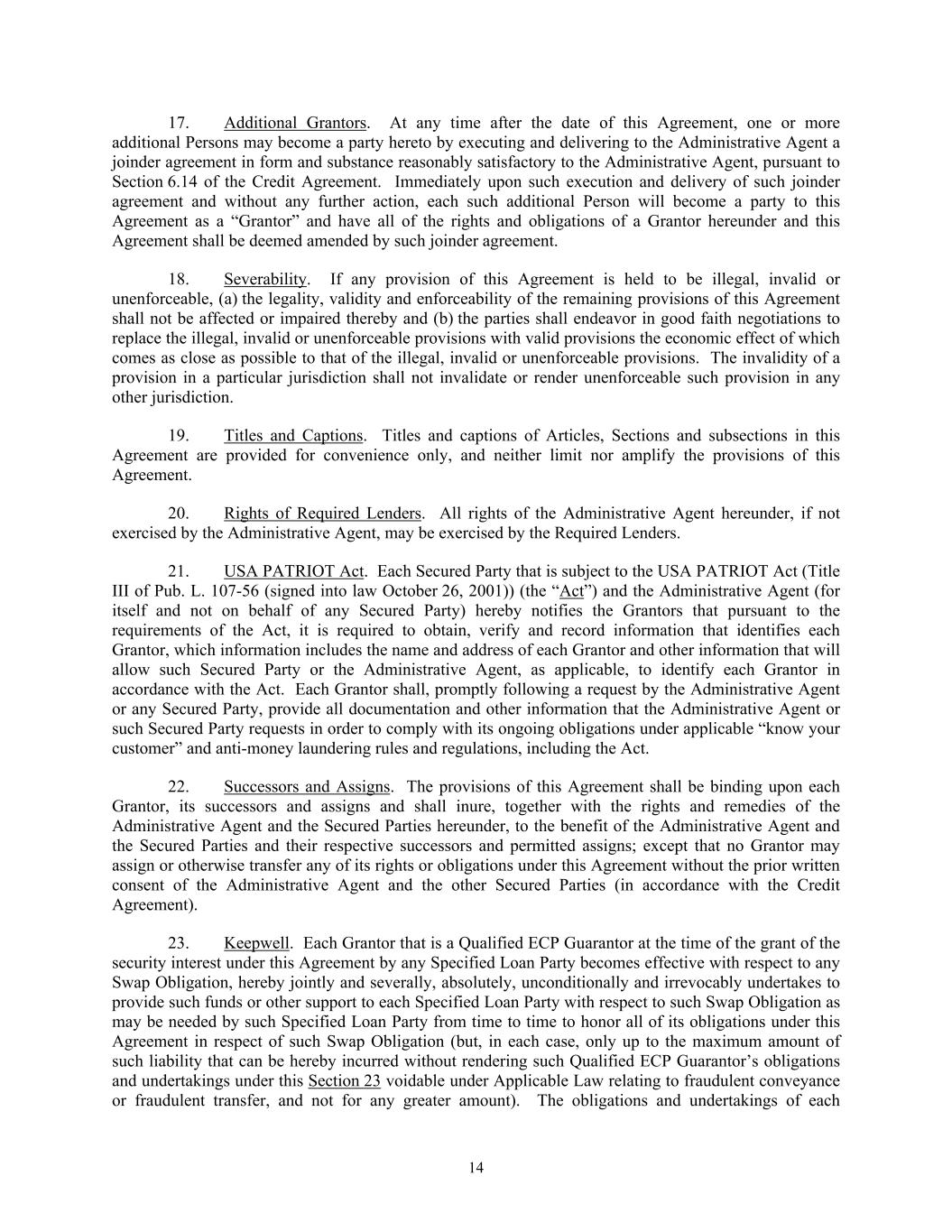 14 17. Additional Grantors. At any time after the date of this Agreement, one or more additional Persons may become a party hereto by executing and delivering to the Administrative Agent a joinder agreement in form and substance reasonably satisfactory to the Administrative Agent, pursuant to Section 6.14 of the Credit Agreement. Immediately upon such execution and delivery of such joinder agreement and without any further action, each such additional Person will become a party to this Agreement as a “Grantor” and have all of the rights and obligations of a Grantor hereunder and this Agreement shall be deemed amended by such joinder agreement. 18. Severability. If any provision of this Agreement is held to be illegal, invalid or unenforceable, (a) the legality, validity and enforceability of the remaining provisions of this Agreement shall not be affected or impaired thereby and (b) the parties shall endeavor in good faith negotiations to replace the illegal, invalid or unenforceable provisions with valid provisions the economic effect of which comes as close as possible to that of the illegal, invalid or unenforceable provisions. The invalidity of a provision in a particular jurisdiction shall not invalidate or render unenforceable such provision in any other jurisdiction. 19. Titles and Captions. Titles and captions of Articles, Sections and subsections in this Agreement are provided for convenience only, and neither limit nor amplify the provisions of this Agreement. 20. Rights of Required Lenders. All rights of the Administrative Agent hereunder, if not exercised by the Administrative Agent, may be exercised by the Required Lenders. 21. USA PATRIOT Act. Each Secured Party that is subject to the USA PATRIOT Act (Title III of Pub. L. 107-56 (signed into law October 26, 2001)) (the “Act”) and the Administrative Agent (for itself and not on behalf of any Secured Party) hereby notifies the Grantors that pursuant to the requirements of the Act, it is required to obtain, verify and record information that identifies each Grantor, which information includes the name and address of each Grantor and other information that will allow such Secured Party or the Administrative Agent, as applicable, to identify each Grantor in accordance with the Act. Each Grantor shall, promptly following a request by the Administrative Agent or any Secured Party, provide all documentation and other information that the Administrative Agent or such Secured Party requests in order to comply with its ongoing obligations under applicable “know your customer” and anti-money laundering rules and regulations, including the Act. 22. Successors and Assigns. The provisions of this Agreement shall be binding upon each Grantor, its successors and assigns and shall inure, together with the rights and remedies of the Administrative Agent and the Secured Parties hereunder, to the benefit of the Administrative Agent and the Secured Parties and their respective successors and permitted assigns; except that no Grantor may assign or otherwise transfer any of its rights or obligations under this Agreement without the prior written consent of the Administrative Agent and the other Secured Parties (in accordance with the Credit Agreement). 23. Keepwell. Each Grantor that is a Qualified ECP Guarantor at the time of the grant of the security interest under this Agreement by any Specified Loan Party becomes effective with respect to any Swap Obligation, hereby jointly and severally, absolutely, unconditionally and irrevocably undertakes to provide such funds or other support to each Specified Loan Party with respect to such Swap Obligation as may be needed by such Specified Loan Party from time to time to honor all of its obligations under this Agreement in respect of such Swap Obligation (but, in each case, only up to the maximum amount of such liability that can be hereby incurred without rendering such Qualified ECP Guarantor’s obligations and undertakings under this Section 23 voidable under Applicable Law relating to fraudulent conveyance or fraudulent transfer, and not for any greater amount). The obligations and undertakings of each