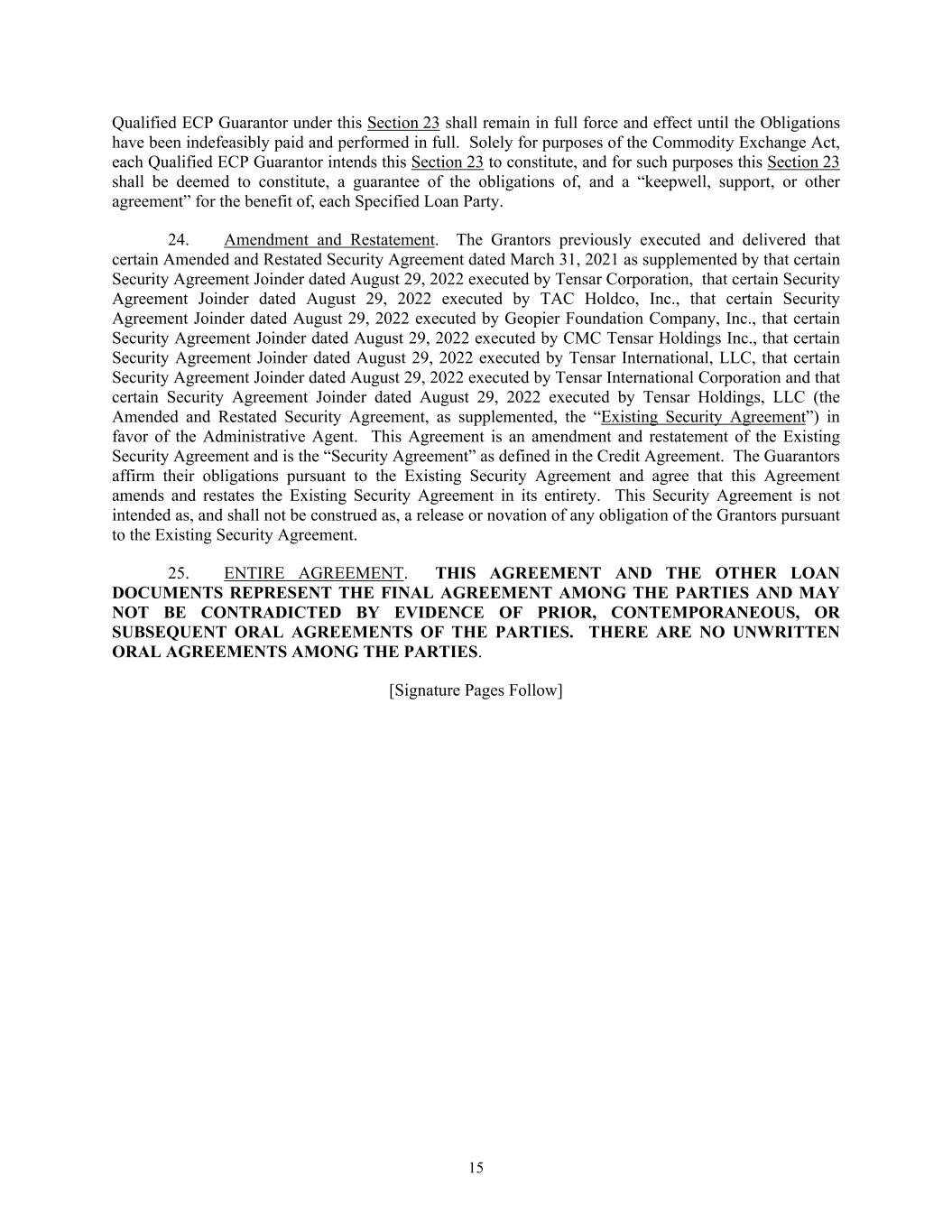 15 Qualified ECP Guarantor under this Section 23 shall remain in full force and effect until the Obligations have been indefeasibly paid and performed in full. Solely for purposes of the Commodity Exchange Act, each Qualified ECP Guarantor intends this Section 23 to constitute, and for such purposes this Section 23 shall be deemed to constitute, a guarantee of the obligations of, and a “keepwell, support, or other agreement” for the benefit of, each Specified Loan Party. 24. Amendment and Restatement. The Grantors previously executed and delivered that certain Amended and Restated Security Agreement dated March 31, 2021 as supplemented by that certain Security Agreement Joinder dated August 29, 2022 executed by Tensar Corporation, that certain Security Agreement Joinder dated August 29, 2022 executed by TAC Holdco, Inc., that certain Security Agreement Joinder dated August 29, 2022 executed by Geopier Foundation Company, Inc., that certain Security Agreement Joinder dated August 29, 2022 executed by CMC Tensar Holdings Inc., that certain Security Agreement Joinder dated August 29, 2022 executed by Tensar International, LLC, that certain Security Agreement Joinder dated August 29, 2022 executed by Tensar International Corporation and that certain Security Agreement Joinder dated August 29, 2022 executed by Tensar Holdings, LLC (the Amended and Restated Security Agreement, as supplemented, the “Existing Security Agreement”) in favor of the Administrative Agent. This Agreement is an amendment and restatement of the Existing Security Agreement and is the “Security Agreement” as defined in the Credit Agreement. The Guarantors affirm their obligations pursuant to the Existing Security Agreement and agree that this Agreement amends and restates the Existing Security Agreement in its entirety. This Security Agreement is not intended as, and shall not be construed as, a release or novation of any obligation of the Grantors pursuant to the Existing Security Agreement. 25. ENTIRE AGREEMENT. THIS AGREEMENT AND THE OTHER LOAN DOCUMENTS REPRESENT THE FINAL AGREEMENT AMONG THE PARTIES AND MAY NOT BE CONTRADICTED BY EVIDENCE OF PRIOR, CONTEMPORANEOUS, OR SUBSEQUENT ORAL AGREEMENTS OF THE PARTIES. THERE ARE NO UNWRITTEN ORAL AGREEMENTS AMONG THE PARTIES. [Signature Pages Follow]