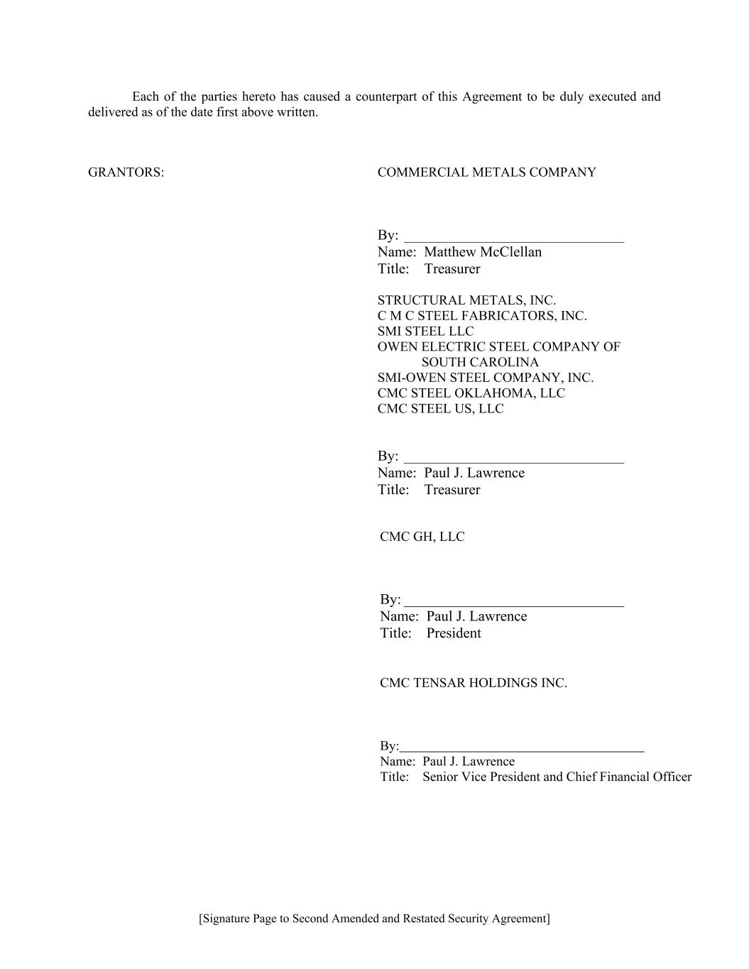 [Signature Page to Second Amended and Restated Security Agreement] Each of the parties hereto has caused a counterpart of this Agreement to be duly executed and delivered as of the date first above written. GRANTORS: COMMERCIAL METALS COMPANY By: ______________________________ Name: Matthew McClellan Title: Treasurer STRUCTURAL METALS, INC. C M C STEEL FABRICATORS, INC. SMI STEEL LLC OWEN ELECTRIC STEEL COMPANY OF SOUTH CAROLINA SMI-OWEN STEEL COMPANY, INC. CMC STEEL OKLAHOMA, LLC CMC STEEL US, LLC By: ______________________________ Name: Paul J. Lawrence Title: Treasurer CMC GH, LLC By: ______________________________ Name: Paul J. Lawrence Title: President CMC TENSAR HOLDINGS INC. By: Name: Paul J. Lawrence Title: Senior Vice President and Chief Financial Officer