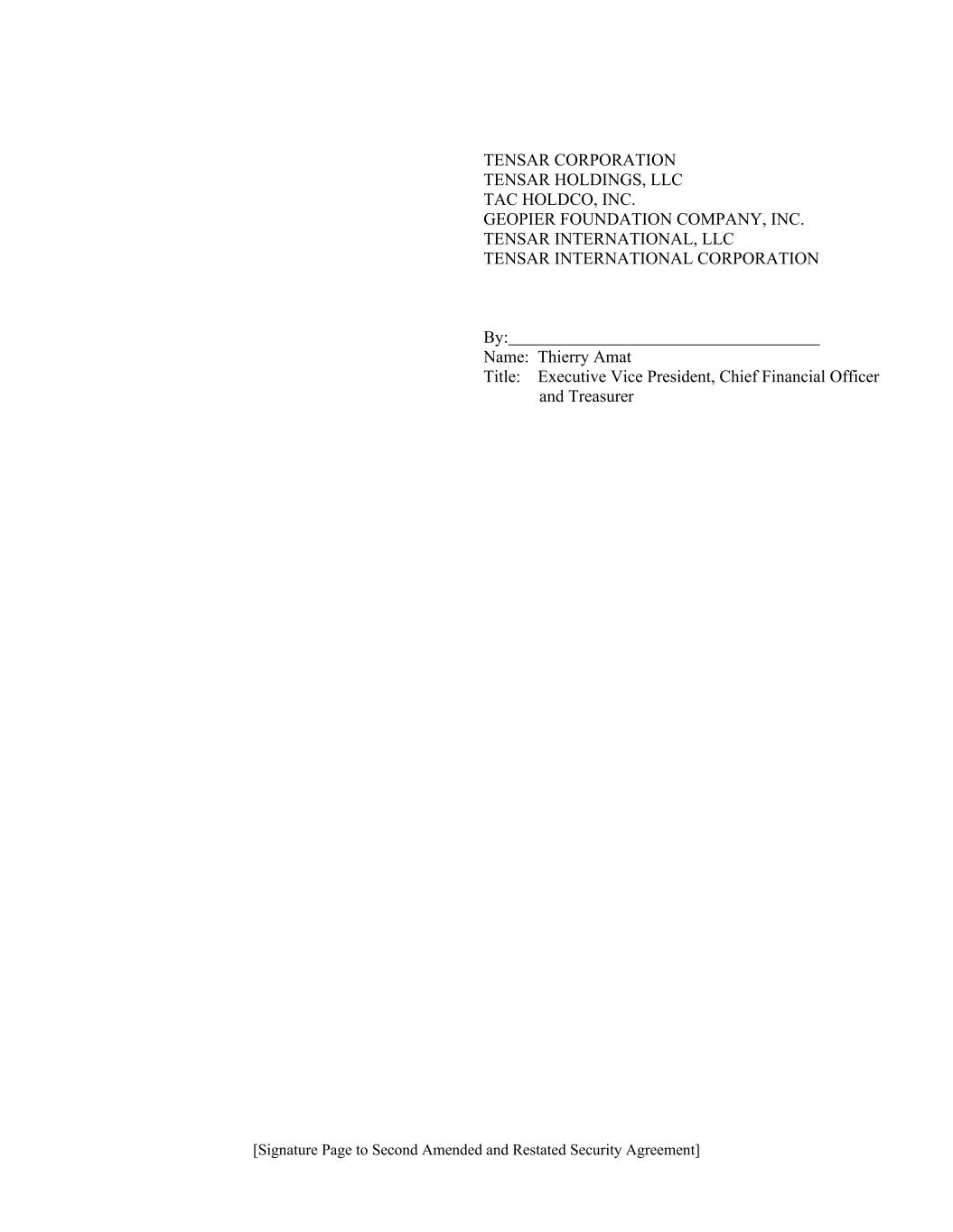 [Signature Page to Second Amended and Restated Security Agreement] TENSAR CORPORATION TENSAR HOLDINGS, LLC TAC HOLDCO, INC. GEOPIER FOUNDATION COMPANY, INC. TENSAR INTERNATIONAL, LLC TENSAR INTERNATIONAL CORPORATION By: Name: Thierry Amat Title: Executive Vice President, Chief Financial Officer and Treasurer