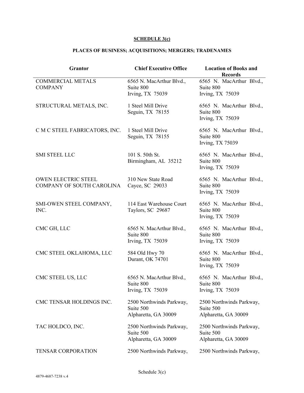 4879-4687-7238 v.4 Schedule 3(c) SCHEDULE 3(c) PLACES OF BUSINESS; ACQUISITIONS; MERGERS; TRADENAMES Grantor Chief Executive Office Location of Books and Records COMMERCIAL METALS COMPANY 6565 N. MacArthur Blvd., Suite 800 Irving, TX 75039 6565 N. MacArthur Blvd., Suite 800 Irving, TX 75039 STRUCTURAL METALS, INC. 1 Steel Mill Drive Seguin, TX 78155 6565 N. MacArthur Blvd., Suite 800 Irving, TX 75039 C M C STEEL FABRICATORS, INC. 1 Steel Mill Drive Seguin, TX 78155 6565 N. MacArthur Blvd., Suite 800 Irving, TX 75039 SMI STEEL LLC 101 S. 50th St. Birmingham, AL 35212 6565 N. MacArthur Blvd., Suite 800 Irving, TX 75039 OWEN ELECTRIC STEEL COMPANY OF SOUTH CAROLINA 310 New State Road Cayce, SC 29033 6565 N. MacArthur Blvd., Suite 800 Irving, TX 75039 SMI-OWEN STEEL COMPANY, INC. 114 East Warehouse Court Taylors, SC 29687 6565 N. MacArthur Blvd., Suite 800 Irving, TX 75039 CMC GH, LLC 6565 N. MacArthur Blvd., Suite 800 Irving, TX 75039 6565 N. MacArthur Blvd., Suite 800 Irving, TX 75039 CMC STEEL OKLAHOMA, LLC 584 Old Hwy 70 Durant, OK 74701 6565 N. MacArthur Blvd., Suite 800 Irving, TX 75039 CMC STEEL US, LLC 6565 N. MacArthur Blvd., Suite 800 Irving, TX 75039 6565 N. MacArthur Blvd., Suite 800 Irving, TX 75039 CMC TENSAR HOLDINGS INC. 2500 Northwinds Parkway, Suite 500 Alpharetta, GA 30009 2500 Northwinds Parkway, Suite 500 Alpharetta, GA 30009 TAC HOLDCO, INC. 2500 Northwinds Parkway, Suite 500 Alpharetta, GA 30009 2500 Northwinds Parkway, Suite 500 Alpharetta, GA 30009 TENSAR CORPORATION 2500 Northwinds Parkway, 2500 Northwinds Parkway,