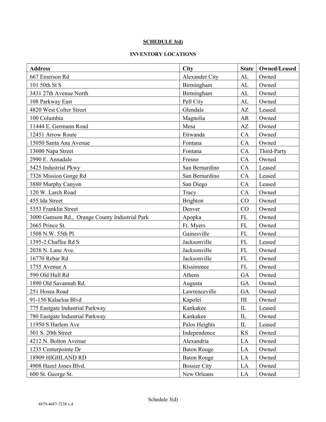 4879-4687-7238 v.4 Schedule 3(d) SCHEDULE 3(d) INVENTORY LOCATIONS Address City State Owned/Leased 667 Emerson Rd Alexander City AL Owned 101 50th St S Birmingham AL Owned 3431 27th Avenue North Birmingham AL Owned 108 Parkway East Pell City AL Owned 4820 West Colter Street Glendale AZ Leased 100 Columbia Magnolia AR Owned 11444 E. Germann Road Mesa AZ Owned 12451 Arrow Route Etiwanda CA Owned 15050 Santa Ana Avenue Fontana CA Owned 13600 Napa Street Fontana CA Third-Party 2990 E. Annadale Fresno CA Owned 5425 Industrial Pkwy San Bernardino CA Leased 7326 Mission Gorge Rd San Bernardino CA Leased 3880 Murphy Canyon San Diego CA Leased 120 W. Larch Road Tracy CA Owned 455 Ida Street Brighton CO Owned 5353 Franklin Street Denver CO Owned 3000 Gamson Rd., Orange County Industrial Park Apopka FL Owned 2665 Prince St. Ft. Myers FL Owned 1508 N.W. 55th Pl. Gainesville FL Owned 1395-2 Chaffee Rd S Jacksonville FL Leased 2038 N. Lane Ave. Jacksonville FL Owned 16770 Rebar Rd Jacksonville FL Owned 1755 Avenue A Kissimmee FL Owned 590 Old Hull Rd Athens GA Owned 1890 Old Savannah Rd. Augusta GA Owned 251 Hosea Road Lawrenceville GA Owned 91-156 Kalaeloa Blvd Kapolei HI Owned 775 Eastgate Industrial Parkway Kankakee IL Leased 780 Eastgate Industrial Parkway Kankakee IL Owned 11950 S Harlem Ave Palos Heights IL Leased 501 S. 20th Street Independence KS Owned 4212 N. Bolton Avenue Alexandria LA Owned 1235 Centerpointe Dr Baton Rouge LA Owned 18909 HIGHLAND RD Baton Rouge LA Owned 4908 Hazel Jones Blvd. Bossier City LA Owned 600 St. George St. New Orleans LA Owned