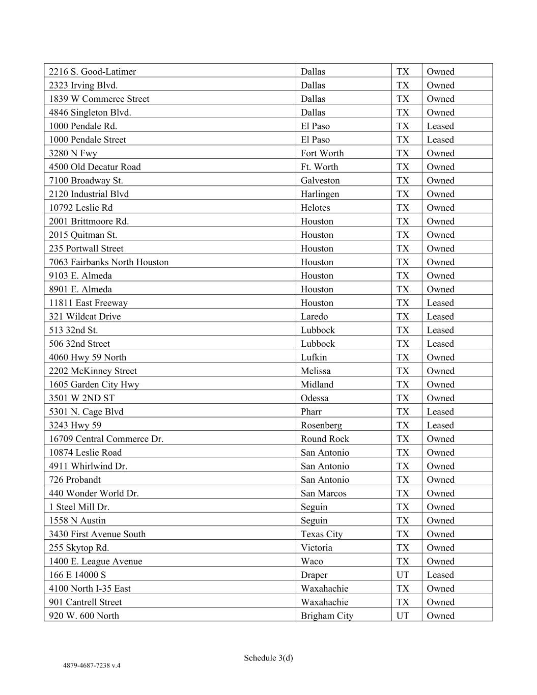 4879-4687-7238 v.4 Schedule 3(d) 2216 S. Good-Latimer Dallas TX Owned 2323 Irving Blvd. Dallas TX Owned 1839 W Commerce Street Dallas TX Owned 4846 Singleton Blvd. Dallas TX Owned 1000 Pendale Rd. El Paso TX Leased 1000 Pendale Street El Paso TX Leased 3280 N Fwy Fort Worth TX Owned 4500 Old Decatur Road Ft. Worth TX Owned 7100 Broadway St. Galveston TX Owned 2120 Industrial Blvd Harlingen TX Owned 10792 Leslie Rd Helotes TX Owned 2001 Brittmoore Rd. Houston TX Owned 2015 Quitman St. Houston TX Owned 235 Portwall Street Houston TX Owned 7063 Fairbanks North Houston Houston TX Owned 9103 E. Almeda Houston TX Owned 8901 E. Almeda Houston TX Owned 11811 East Freeway Houston TX Leased 321 Wildcat Drive Laredo TX Leased 513 32nd St. Lubbock TX Leased 506 32nd Street Lubbock TX Leased 4060 Hwy 59 North Lufkin TX Owned 2202 McKinney Street Melissa TX Owned 1605 Garden City Hwy Midland TX Owned 3501 W 2ND ST Odessa TX Owned 5301 N. Cage Blvd Pharr TX Leased 3243 Hwy 59 Rosenberg TX Leased 16709 Central Commerce Dr. Round Rock TX Owned 10874 Leslie Road San Antonio TX Owned 4911 Whirlwind Dr. San Antonio TX Owned 726 Probandt San Antonio TX Owned 440 Wonder World Dr. San Marcos TX Owned 1 Steel Mill Dr. Seguin TX Owned 1558 N Austin Seguin TX Owned 3430 First Avenue South Texas City TX Owned 255 Skytop Rd. Victoria TX Owned 1400 E. League Avenue Waco TX Owned 166 E 14000 S Draper UT Leased 4100 North I-35 East Waxahachie TX Owned 901 Cantrell Street Waxahachie TX Owned 920 W. 600 North Brigham City UT Owned