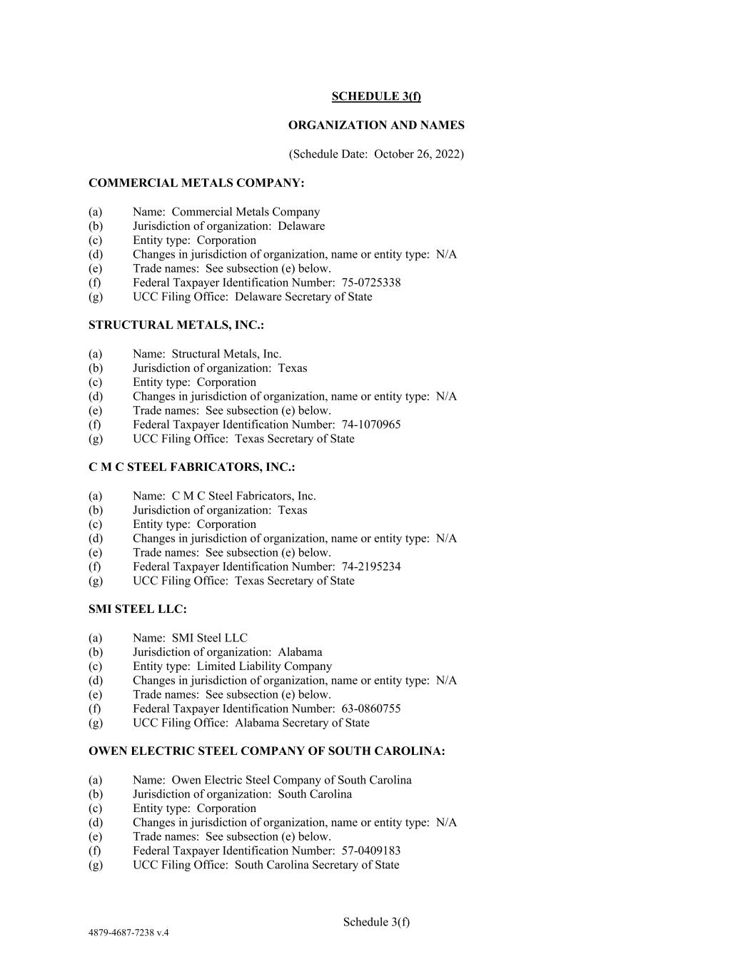 4879-4687-7238 v.4 Schedule 3(f) SCHEDULE 3(f) ORGANIZATION AND NAMES (Schedule Date: October 26, 2022) COMMERCIAL METALS COMPANY: (a) Name: Commercial Metals Company (b) Jurisdiction of organization: Delaware (c) Entity type: Corporation (d) Changes in jurisdiction of organization, name or entity type: N/A (e) Trade names: See subsection (e) below. (f) Federal Taxpayer Identification Number: 75-0725338 (g) UCC Filing Office: Delaware Secretary of State STRUCTURAL METALS, INC.: (a) Name: Structural Metals, Inc. (b) Jurisdiction of organization: Texas (c) Entity type: Corporation (d) Changes in jurisdiction of organization, name or entity type: N/A (e) Trade names: See subsection (e) below. (f) Federal Taxpayer Identification Number: 74-1070965 (g) UCC Filing Office: Texas Secretary of State C M C STEEL FABRICATORS, INC.: (a) Name: C M C Steel Fabricators, Inc. (b) Jurisdiction of organization: Texas (c) Entity type: Corporation (d) Changes in jurisdiction of organization, name or entity type: N/A (e) Trade names: See subsection (e) below. (f) Federal Taxpayer Identification Number: 74-2195234 (g) UCC Filing Office: Texas Secretary of State SMI STEEL LLC: (a) Name: SMI Steel LLC (b) Jurisdiction of organization: Alabama (c) Entity type: Limited Liability Company (d) Changes in jurisdiction of organization, name or entity type: N/A (e) Trade names: See subsection (e) below. (f) Federal Taxpayer Identification Number: 63-0860755 (g) UCC Filing Office: Alabama Secretary of State OWEN ELECTRIC STEEL COMPANY OF SOUTH CAROLINA: (a) Name: Owen Electric Steel Company of South Carolina (b) Jurisdiction of organization: South Carolina (c) Entity type: Corporation (d) Changes in jurisdiction of organization, name or entity type: N/A (e) Trade names: See subsection (e) below. (f) Federal Taxpayer Identification Number: 57-0409183 (g) UCC Filing Office: South Carolina Secretary of State