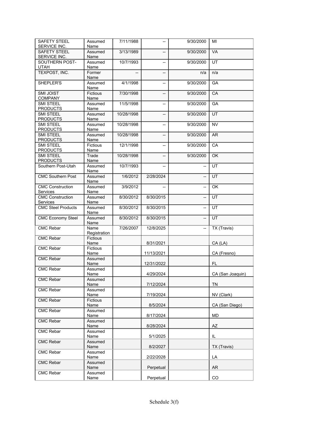 Schedule 3(f) SAFETY STEEL SERVICE INC. Assumed Name 7/11/1988 -- 9/30/2000 MI SAFETY STEEL SERVICE INC. Assumed Name 3/13/1989 -- 9/30/2000 VA SOUTHERN POST- UTAH Assumed Name 10/7/1993 -- 9/30/2000 UT TEXPOST, INC. Former Name -- -- n/a n/a SHEPLER'S Assumed Name 4/1/1998 -- 9/30/2000 GA SMI JOIST COMPANY Fictious Name 7/30/1998 -- 9/30/2000 CA SMI STEEL PRODUCTS Assumed Name 11/5/1998 -- 9/30/2000 GA SMI STEEL PRODUCTS Assumed Name 10/28/1998 -- 9/30/2000 UT SMI STEEL PRODUCTS Assumed Name 10/28/1998 -- 9/30/2000 NV SMI STEEL PRODUCTS Assumed Name 10/28/1998 -- 9/30/2000 AR SMI STEEL PRODUCTS Fictious Name 12/1/1998 -- 9/30/2000 CA SMI STEEL PRODUCTS Trade Name 10/28/1998 -- 9/30/2000 OK Southern Post-Utah Assumed Name 10/7/1993 -- -- UT CMC Southern Post Assumed Name 1/6/2012 2/28/2024 -- UT CMC Construction Services Assumed Name 3/9/2012 -- -- OK CMC Construction Services Assumed Name 8/30/2012 8/30/2015 -- UT CMC Steel Products Assumed Name 8/30/2012 8/30/2015 -- UT CMC Economy Steel Assumed Name 8/30/2012 8/30/2015 -- UT CMC Rebar Name Registration 7/26/2007 12/8/2025 -- TX (Travis) CMC Rebar Fictious Name 8/31/2021 CA (LA) CMC Rebar Fictious Name 11/13/2021 CA (Fresno) CMC Rebar Assumed Name 12/31/2022 FL CMC Rebar Assumed Name 4/29/2024 CA (San Joaquin) CMC Rebar Assumed Name 7/12/2024 TN CMC Rebar Assumed Name 7/19/2024 NV (Clark) CMC Rebar Fictious Name 8/5/2024 CA (San Diego) CMC Rebar Assumed Name 8/17/2024 MD CMC Rebar Assumed Name 8/28/2024 AZ CMC Rebar Assumed Name 5/1/2025 IL CMC Rebar Assumed Name 8/2/2027 TX (Travis) CMC Rebar Assumed Name 2/22/2028 LA CMC Rebar Assumed Name Perpetual AR CMC Rebar Assumed Name Perpetual CO