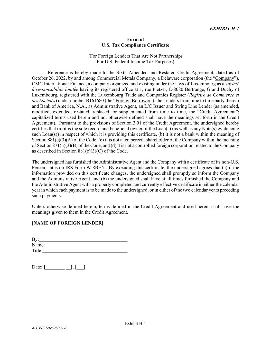 Exhibit H-1 ACTIVE 682595837v3 EXHIBIT H-1 Form of U.S. Tax Compliance Certificate (For Foreign Lenders That Are Not Partnerships For U.S. Federal Income Tax Purposes) Reference is hereby made to the Sixth Amended and Restated Credit Agreement, dated as of October 26, 2022, by and among Commercial Metals Company, a Delaware corporation (the “Company”), CMC International Finance, a company organized and existing under the laws of Luxembourg as a société à responsabilité limitée having its registered office at 1, rue Pletzer, L-8080 Bertrange, Grand Duchy of Luxembourg, registered with the Luxembourg Trade and Companies Register (Registre de Commerce et des Sociétés) under number B161680 (the “Foreign Borrower”), the Lenders from time to time party thereto and Bank of America, N.A., as Administrative Agent, an L/C Issuer and Swing Line Lender (as amended, modified, extended, restated, replaced, or supplemented from time to time, the “Credit Agreement”; capitalized terms used herein and not otherwise defined shall have the meanings set forth in the Credit Agreement). Pursuant to the provisions of Section 3.01 of the Credit Agreement, the undersigned hereby certifies that (a) it is the sole record and beneficial owner of the Loan(s) (as well as any Note(s) evidencing such Loan(s)) in respect of which it is providing this certificate, (b) it is not a bank within the meaning of Section 881(c)(3)(A) of the Code, (c) it is not a ten percent shareholder of the Company within the meaning of Section 871(h)(3)(B) of the Code, and (d) it is not a controlled foreign corporation related to the Company as described in Section 881(c)(3)(C) of the Code. The undersigned has furnished the Administrative Agent and the Company with a certificate of its non-U.S. Person status on IRS Form W-8BEN. By executing this certificate, the undersigned agrees that (a) if the information provided on this certificate changes, the undersigned shall promptly so inform the Company and the Administrative Agent, and (b) the undersigned shall have at all times furnished the Company and the Administrative Agent with a properly completed and currently effective certificate in either the calendar year in which each payment is to be made to the undersigned, or in either of the two calendar years preceding such payments. Unless otherwise defined herein, terms defined in the Credit Agreement and used herein shall have the meanings given to them in the Credit Agreement. [NAME OF FOREIGN LENDER] By: Name: Title: Date: [________ __], [___]