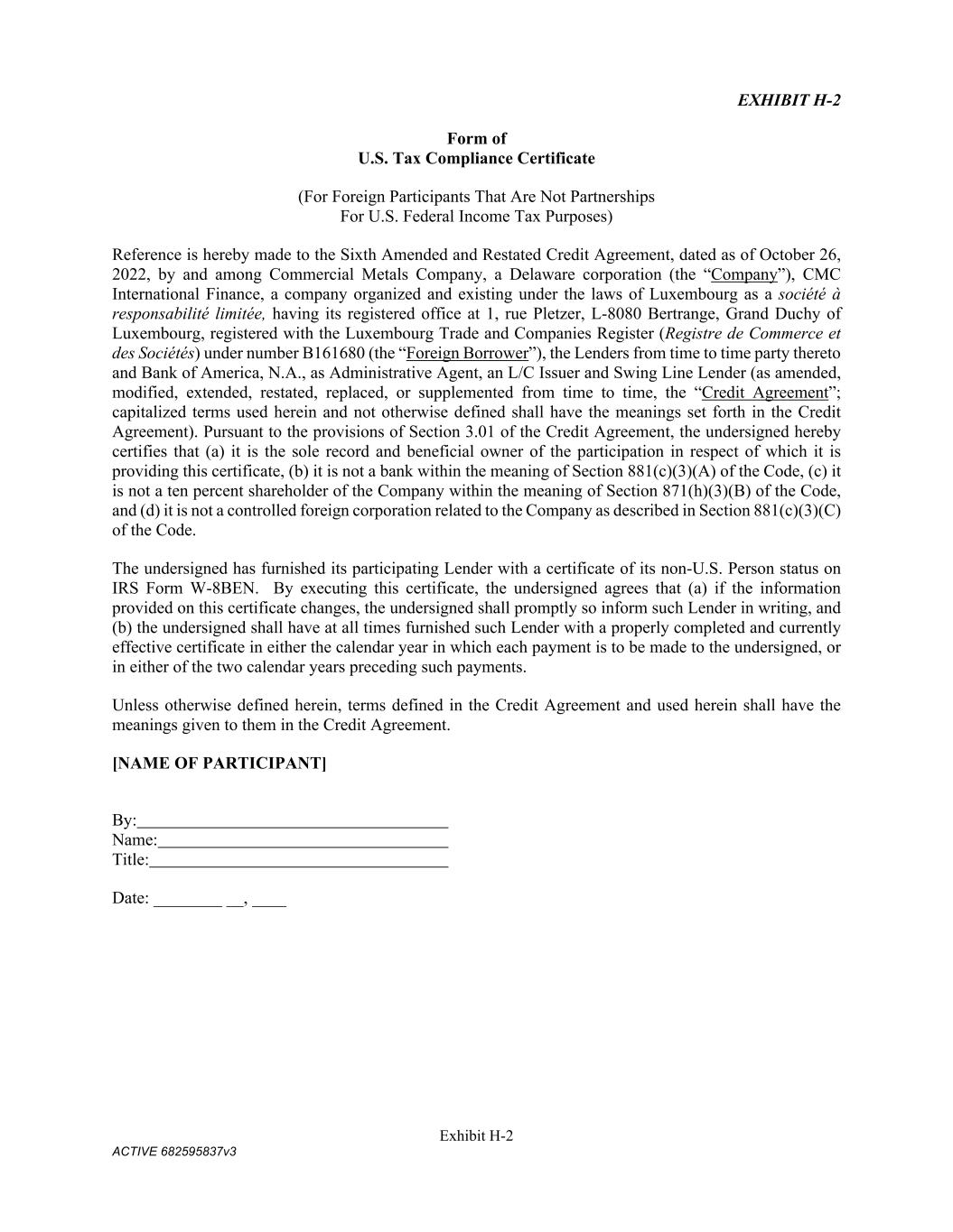 Exhibit H-2 ACTIVE 682595837v3 EXHIBIT H-2 Form of U.S. Tax Compliance Certificate (For Foreign Participants That Are Not Partnerships For U.S. Federal Income Tax Purposes) Reference is hereby made to the Sixth Amended and Restated Credit Agreement, dated as of October 26, 2022, by and among Commercial Metals Company, a Delaware corporation (the “Company”), CMC International Finance, a company organized and existing under the laws of Luxembourg as a société à responsabilité limitée, having its registered office at 1, rue Pletzer, L-8080 Bertrange, Grand Duchy of Luxembourg, registered with the Luxembourg Trade and Companies Register (Registre de Commerce et des Sociétés) under number B161680 (the “Foreign Borrower”), the Lenders from time to time party thereto and Bank of America, N.A., as Administrative Agent, an L/C Issuer and Swing Line Lender (as amended, modified, extended, restated, replaced, or supplemented from time to time, the “Credit Agreement”; capitalized terms used herein and not otherwise defined shall have the meanings set forth in the Credit Agreement). Pursuant to the provisions of Section 3.01 of the Credit Agreement, the undersigned hereby certifies that (a) it is the sole record and beneficial owner of the participation in respect of which it is providing this certificate, (b) it is not a bank within the meaning of Section 881(c)(3)(A) of the Code, (c) it is not a ten percent shareholder of the Company within the meaning of Section 871(h)(3)(B) of the Code, and (d) it is not a controlled foreign corporation related to the Company as described in Section 881(c)(3)(C) of the Code. The undersigned has furnished its participating Lender with a certificate of its non-U.S. Person status on IRS Form W-8BEN. By executing this certificate, the undersigned agrees that (a) if the information provided on this certificate changes, the undersigned shall promptly so inform such Lender in writing, and (b) the undersigned shall have at all times furnished such Lender with a properly completed and currently effective certificate in either the calendar year in which each payment is to be made to the undersigned, or in either of the two calendar years preceding such payments. Unless otherwise defined herein, terms defined in the Credit Agreement and used herein shall have the meanings given to them in the Credit Agreement. [NAME OF PARTICIPANT] By: Name: Title: Date: ________ __, ____
