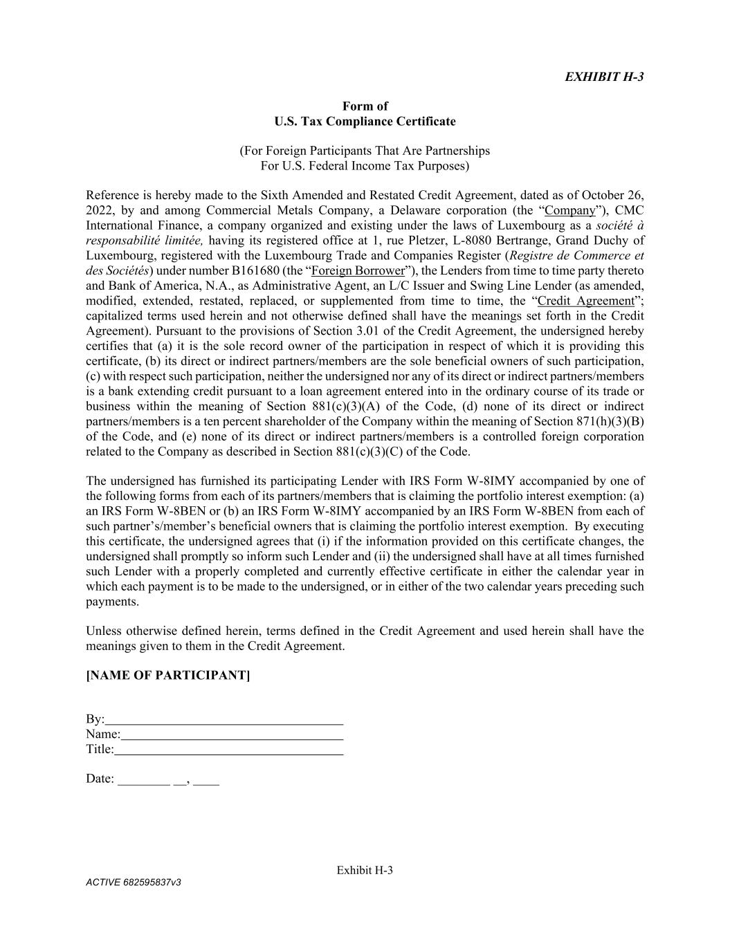 Exhibit H-3 ACTIVE 682595837v3 EXHIBIT H-3 Form of U.S. Tax Compliance Certificate (For Foreign Participants That Are Partnerships For U.S. Federal Income Tax Purposes) Reference is hereby made to the Sixth Amended and Restated Credit Agreement, dated as of October 26, 2022, by and among Commercial Metals Company, a Delaware corporation (the “Company”), CMC International Finance, a company organized and existing under the laws of Luxembourg as a société à responsabilité limitée, having its registered office at 1, rue Pletzer, L-8080 Bertrange, Grand Duchy of Luxembourg, registered with the Luxembourg Trade and Companies Register (Registre de Commerce et des Sociétés) under number B161680 (the “Foreign Borrower”), the Lenders from time to time party thereto and Bank of America, N.A., as Administrative Agent, an L/C Issuer and Swing Line Lender (as amended, modified, extended, restated, replaced, or supplemented from time to time, the “Credit Agreement”; capitalized terms used herein and not otherwise defined shall have the meanings set forth in the Credit Agreement). Pursuant to the provisions of Section 3.01 of the Credit Agreement, the undersigned hereby certifies that (a) it is the sole record owner of the participation in respect of which it is providing this certificate, (b) its direct or indirect partners/members are the sole beneficial owners of such participation, (c) with respect such participation, neither the undersigned nor any of its direct or indirect partners/members is a bank extending credit pursuant to a loan agreement entered into in the ordinary course of its trade or business within the meaning of Section 881(c)(3)(A) of the Code, (d) none of its direct or indirect partners/members is a ten percent shareholder of the Company within the meaning of Section 871(h)(3)(B) of the Code, and (e) none of its direct or indirect partners/members is a controlled foreign corporation related to the Company as described in Section 881(c)(3)(C) of the Code. The undersigned has furnished its participating Lender with IRS Form W-8IMY accompanied by one of the following forms from each of its partners/members that is claiming the portfolio interest exemption: (a) an IRS Form W-8BEN or (b) an IRS Form W-8IMY accompanied by an IRS Form W-8BEN from each of such partner’s/member’s beneficial owners that is claiming the portfolio interest exemption. By executing this certificate, the undersigned agrees that (i) if the information provided on this certificate changes, the undersigned shall promptly so inform such Lender and (ii) the undersigned shall have at all times furnished such Lender with a properly completed and currently effective certificate in either the calendar year in which each payment is to be made to the undersigned, or in either of the two calendar years preceding such payments. Unless otherwise defined herein, terms defined in the Credit Agreement and used herein shall have the meanings given to them in the Credit Agreement. [NAME OF PARTICIPANT] By: Name: Title: Date: ________ __, ____