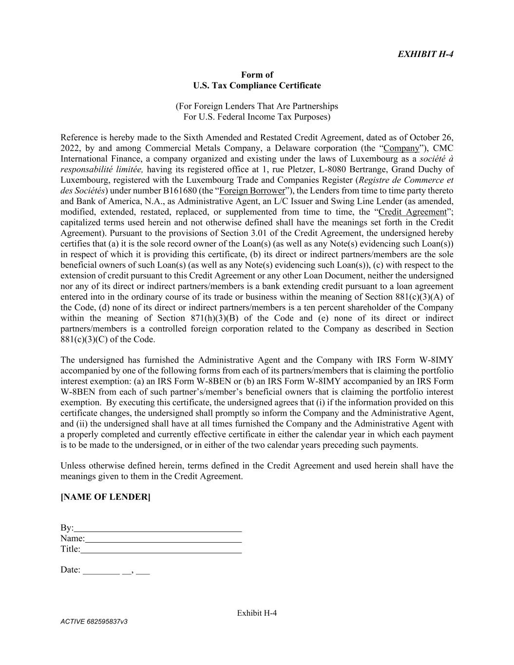 Exhibit H-4 ACTIVE 682595837v3 EXHIBIT H-4 Form of U.S. Tax Compliance Certificate (For Foreign Lenders That Are Partnerships For U.S. Federal Income Tax Purposes) Reference is hereby made to the Sixth Amended and Restated Credit Agreement, dated as of October 26, 2022, by and among Commercial Metals Company, a Delaware corporation (the “Company”), CMC International Finance, a company organized and existing under the laws of Luxembourg as a société à responsabilité limitée, having its registered office at 1, rue Pletzer, L-8080 Bertrange, Grand Duchy of Luxembourg, registered with the Luxembourg Trade and Companies Register (Registre de Commerce et des Sociétés) under number B161680 (the “Foreign Borrower”), the Lenders from time to time party thereto and Bank of America, N.A., as Administrative Agent, an L/C Issuer and Swing Line Lender (as amended, modified, extended, restated, replaced, or supplemented from time to time, the “Credit Agreement”; capitalized terms used herein and not otherwise defined shall have the meanings set forth in the Credit Agreement). Pursuant to the provisions of Section 3.01 of the Credit Agreement, the undersigned hereby certifies that (a) it is the sole record owner of the Loan(s) (as well as any Note(s) evidencing such Loan(s)) in respect of which it is providing this certificate, (b) its direct or indirect partners/members are the sole beneficial owners of such Loan(s) (as well as any Note(s) evidencing such Loan(s)), (c) with respect to the extension of credit pursuant to this Credit Agreement or any other Loan Document, neither the undersigned nor any of its direct or indirect partners/members is a bank extending credit pursuant to a loan agreement entered into in the ordinary course of its trade or business within the meaning of Section 881(c)(3)(A) of the Code, (d) none of its direct or indirect partners/members is a ten percent shareholder of the Company within the meaning of Section 871(h)(3)(B) of the Code and (e) none of its direct or indirect partners/members is a controlled foreign corporation related to the Company as described in Section 881(c)(3)(C) of the Code. The undersigned has furnished the Administrative Agent and the Company with IRS Form W-8IMY accompanied by one of the following forms from each of its partners/members that is claiming the portfolio interest exemption: (a) an IRS Form W-8BEN or (b) an IRS Form W-8IMY accompanied by an IRS Form W-8BEN from each of such partner’s/member’s beneficial owners that is claiming the portfolio interest exemption. By executing this certificate, the undersigned agrees that (i) if the information provided on this certificate changes, the undersigned shall promptly so inform the Company and the Administrative Agent, and (ii) the undersigned shall have at all times furnished the Company and the Administrative Agent with a properly completed and currently effective certificate in either the calendar year in which each payment is to be made to the undersigned, or in either of the two calendar years preceding such payments. Unless otherwise defined herein, terms defined in the Credit Agreement and used herein shall have the meanings given to them in the Credit Agreement. [NAME OF LENDER] By: Name: Title: Date: ________ __, ___