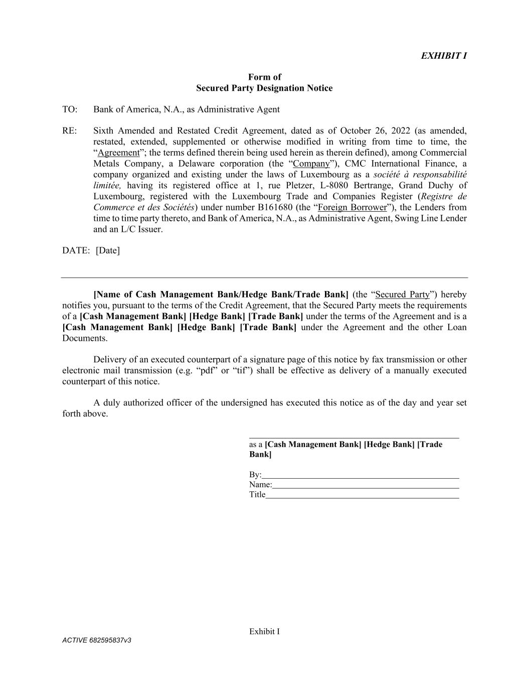 Exhibit I ACTIVE 682595837v3 EXHIBIT I Form of Secured Party Designation Notice TO: Bank of America, N.A., as Administrative Agent RE: Sixth Amended and Restated Credit Agreement, dated as of October 26, 2022 (as amended, restated, extended, supplemented or otherwise modified in writing from time to time, the “Agreement”; the terms defined therein being used herein as therein defined), among Commercial Metals Company, a Delaware corporation (the “Company”), CMC International Finance, a company organized and existing under the laws of Luxembourg as a société à responsabilité limitée, having its registered office at 1, rue Pletzer, L-8080 Bertrange, Grand Duchy of Luxembourg, registered with the Luxembourg Trade and Companies Register (Registre de Commerce et des Sociétés) under number B161680 (the “Foreign Borrower”), the Lenders from time to time party thereto, and Bank of America, N.A., as Administrative Agent, Swing Line Lender and an L/C Issuer. DATE: [Date] [Name of Cash Management Bank/Hedge Bank/Trade Bank] (the “Secured Party”) hereby notifies you, pursuant to the terms of the Credit Agreement, that the Secured Party meets the requirements of a [Cash Management Bank] [Hedge Bank] [Trade Bank] under the terms of the Agreement and is a [Cash Management Bank] [Hedge Bank] [Trade Bank] under the Agreement and the other Loan Documents. Delivery of an executed counterpart of a signature page of this notice by fax transmission or other electronic mail transmission (e.g. “pdf” or “tif”) shall be effective as delivery of a manually executed counterpart of this notice. A duly authorized officer of the undersigned has executed this notice as of the day and year set forth above. as a [Cash Management Bank] [Hedge Bank] [Trade Bank] By: Name: Title