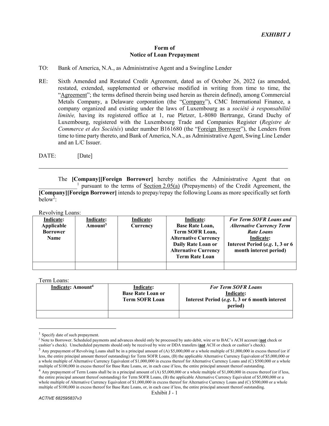 Exhibit J - 1 ACTIVE 682595837v3 EXHIBIT J Form of Notice of Loan Prepayment TO: Bank of America, N.A., as Administrative Agent and a Swingline Lender RE: Sixth Amended and Restated Credit Agreement, dated as of October 26, 2022 (as amended, restated, extended, supplemented or otherwise modified in writing from time to time, the “Agreement”; the terms defined therein being used herein as therein defined), among Commercial Metals Company, a Delaware corporation (the “Company”), CMC International Finance, a company organized and existing under the laws of Luxembourg as a société à responsabilité limitée, having its registered office at 1, rue Pletzer, L-8080 Bertrange, Grand Duchy of Luxembourg, registered with the Luxembourg Trade and Companies Register (Registre de Commerce et des Sociétés) under number B161680 (the “Foreign Borrower”), the Lenders from time to time party thereto, and Bank of America, N.A., as Administrative Agent, Swing Line Lender and an L/C Issuer. DATE: [Date] The [Company][Foreign Borrower] hereby notifies the Administrative Agent that on _____________1 pursuant to the terms of Section 2.05(a) (Prepayments) of the Credit Agreement, the [Company][Foreign Borrower] intends to prepay/repay the following Loans as more specifically set forth below2: Revolving Loans: Indicate: Applicable Borrower Name Indicate: Amount3 Indicate: Currency Indicate: Base Rate Loan, Term SOFR Loan, Alternative Currency Daily Rate Loan or Alternative Currency Term Rate Loan For Term SOFR Loans and Alternative Currency Term Rate Loans Indicate: Interest Period (e.g. 1, 3 or 6 month interest period) Term Loans: Indicate: Amount4 Indicate: Base Rate Loan or Term SOFR Loan For Term SOFR Loans Indicate: Interest Period (e.g. 1, 3 or 6 month interest period) 1 Specify date of such prepayment. 2 Note to Borrower. Scheduled payments and advances should only be processed by auto debit, wire or to BAC’s ACH account (not check or cashier’s check). Unscheduled payments should only be received by wire or DDA transfers (not ACH or check or cashier’s check). 3 Any prepayment of Revolving Loans shall be in a principal amount of (A) $5,000,000 or a whole multiple of $1,000,000 in excess thereof (or if less, the entire principal amount thereof outstanding) for Term SOFR Loans, (B) the applicable Alternative Currency Equivalent of $5,000,000 or a whole multiple of Alternative Currency Equivalent of $1,000,000 in excess thereof for Alternative Currency Loans and (C) $500,000 or a whole multiple of $100,000 in excess thereof for Base Rate Loans, or, in each case if less, the entire principal amount thereof outstanding. 4 Any prepayment of Term Loans shall be in a principal amount of (A) $5,000,000 or a whole multiple of $1,000,000 in excess thereof (or if less, the entire principal amount thereof outstanding) for Term SOFR Loans, (B) the applicable Alternative Currency Equivalent of $5,000,000 or a whole multiple of Alternative Currency Equivalent of $1,000,000 in excess thereof for Alternative Currency Loans and (C) $500,000 or a whole multiple of $100,000 in excess thereof for Base Rate Loans, or, in each case if less, the entire principal amount thereof outstanding.