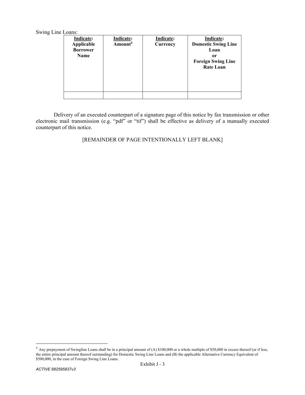 Exhibit J - 3 ACTIVE 682595837v3 Swing Line Loans: Indicate: Applicable Borrower Name Indicate: Amount5 Indicate: Currency Indicate: Domestic Swing Line Loan or Foreign Swing Line Rate Loan Delivery of an executed counterpart of a signature page of this notice by fax transmission or other electronic mail transmission (e.g. “pdf” or “tif”) shall be effective as delivery of a manually executed counterpart of this notice. [REMAINDER OF PAGE INTENTIONALLY LEFT BLANK] 5 Any prepayment of Swingline Loans shall be in a principal amount of (A) $100,000 or a whole multiple of $50,000 in excess thereof (or if less, the entire principal amount thereof outstanding) for Domestic Swing Line Loans and (B) the applicable Alternative Currency Equivalent of $500,000, in the case of Foreign Swing Line Loans.