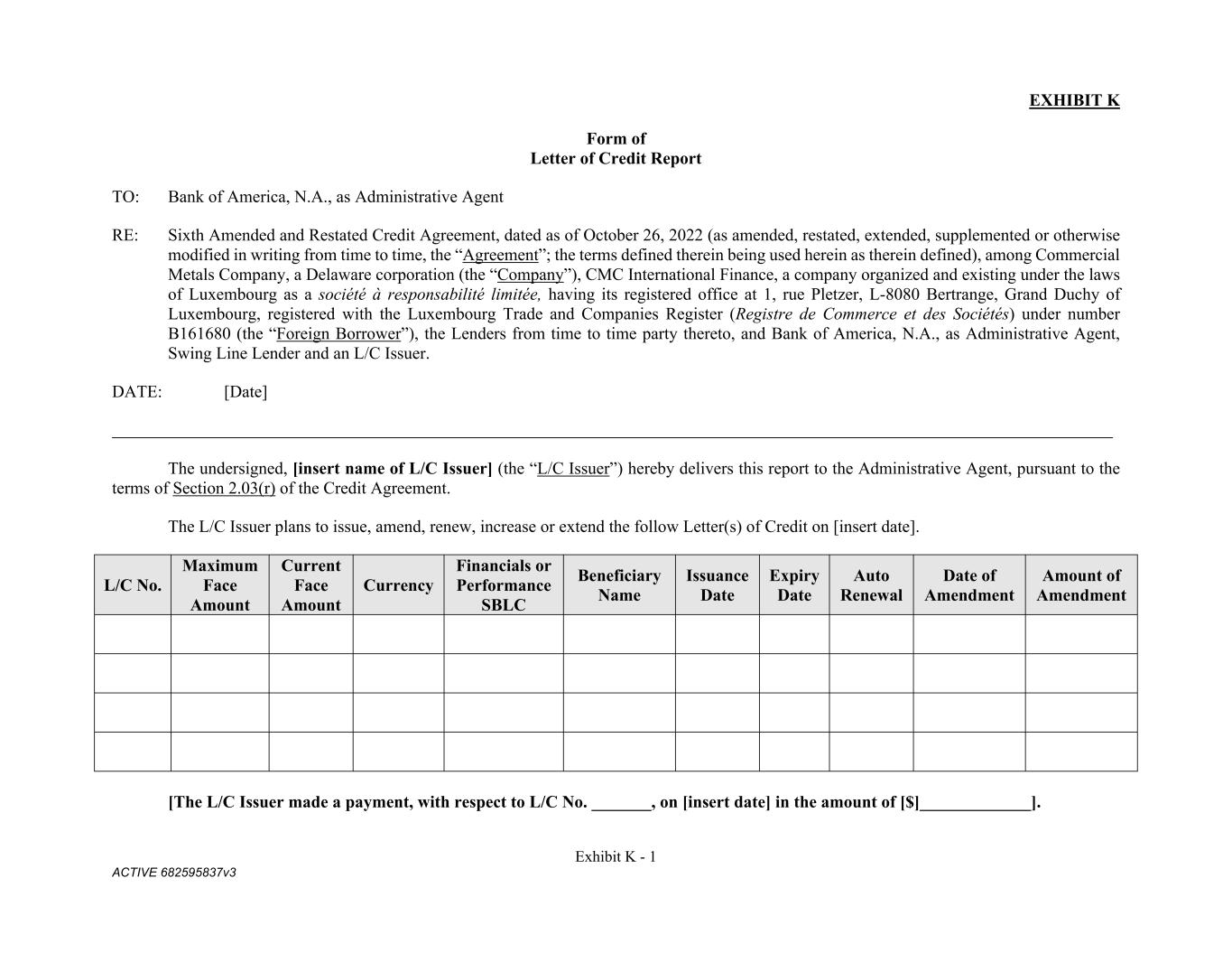 Exhibit K - 1 ACTIVE 682595837v3 EXHIBIT K Form of Letter of Credit Report TO: Bank of America, N.A., as Administrative Agent RE: Sixth Amended and Restated Credit Agreement, dated as of October 26, 2022 (as amended, restated, extended, supplemented or otherwise modified in writing from time to time, the “Agreement”; the terms defined therein being used herein as therein defined), among Commercial Metals Company, a Delaware corporation (the “Company”), CMC International Finance, a company organized and existing under the laws of Luxembourg as a société à responsabilité limitée, having its registered office at 1, rue Pletzer, L-8080 Bertrange, Grand Duchy of Luxembourg, registered with the Luxembourg Trade and Companies Register (Registre de Commerce et des Sociétés) under number B161680 (the “Foreign Borrower”), the Lenders from time to time party thereto, and Bank of America, N.A., as Administrative Agent, Swing Line Lender and an L/C Issuer. DATE: [Date] The undersigned, [insert name of L/C Issuer] (the “L/C Issuer”) hereby delivers this report to the Administrative Agent, pursuant to the terms of Section 2.03(r) of the Credit Agreement. The L/C Issuer plans to issue, amend, renew, increase or extend the follow Letter(s) of Credit on [insert date]. L/C No. Maximum Face Amount Current Face Amount Currency Financials or Performance SBLC Beneficiary Name Issuance Date Expiry Date Auto Renewal Date of Amendment Amount of Amendment [The L/C Issuer made a payment, with respect to L/C No. _______, on [insert date] in the amount of [$]_____________].