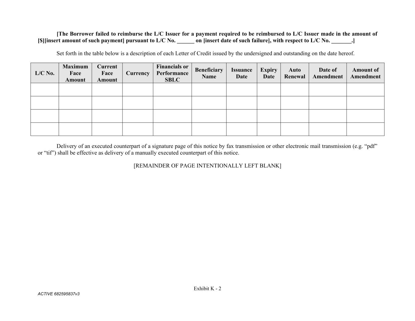 Exhibit K - 2 ACTIVE 682595837v3 [The Borrower failed to reimburse the L/C Issuer for a payment required to be reimbursed to L/C Issuer made in the amount of [$][insert amount of such payment] pursuant to L/C No. ______ on [insert date of such failure], with respect to L/C No. _______.] Set forth in the table below is a description of each Letter of Credit issued by the undersigned and outstanding on the date hereof. L/C No. Maximum Face Amount Current Face Amount Currency Financials or Performance SBLC Beneficiary Name Issuance Date Expiry Date Auto Renewal Date of Amendment Amount of Amendment Delivery of an executed counterpart of a signature page of this notice by fax transmission or other electronic mail transmission (e.g. “pdf” or “tif”) shall be effective as delivery of a manually executed counterpart of this notice. [REMAINDER OF PAGE INTENTIONALLY LEFT BLANK]