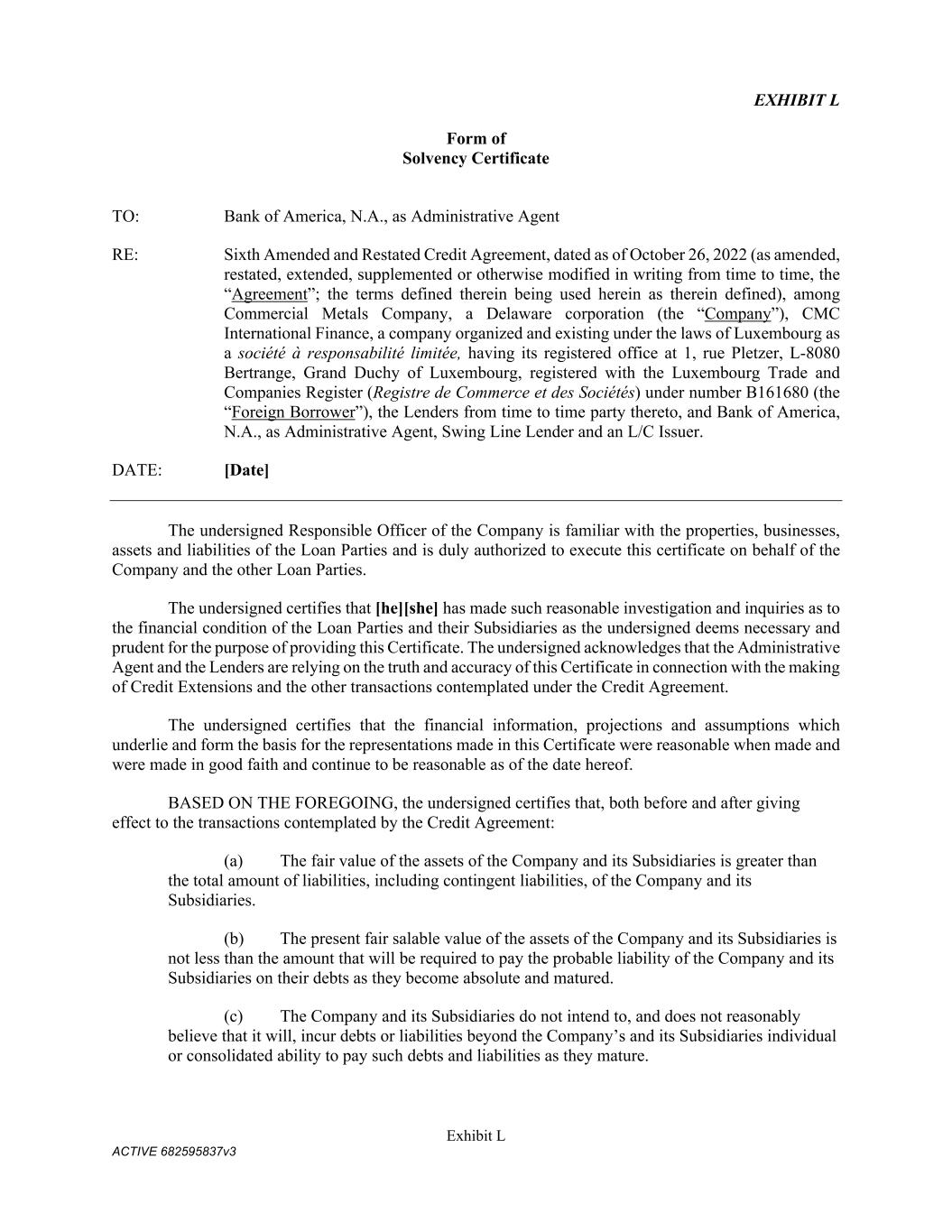 Exhibit L ACTIVE 682595837v3 EXHIBIT L Form of Solvency Certificate TO: Bank of America, N.A., as Administrative Agent RE: Sixth Amended and Restated Credit Agreement, dated as of October 26, 2022 (as amended, restated, extended, supplemented or otherwise modified in writing from time to time, the “Agreement”; the terms defined therein being used herein as therein defined), among Commercial Metals Company, a Delaware corporation (the “Company”), CMC International Finance, a company organized and existing under the laws of Luxembourg as a société à responsabilité limitée, having its registered office at 1, rue Pletzer, L-8080 Bertrange, Grand Duchy of Luxembourg, registered with the Luxembourg Trade and Companies Register (Registre de Commerce et des Sociétés) under number B161680 (the “Foreign Borrower”), the Lenders from time to time party thereto, and Bank of America, N.A., as Administrative Agent, Swing Line Lender and an L/C Issuer. DATE: [Date] The undersigned Responsible Officer of the Company is familiar with the properties, businesses, assets and liabilities of the Loan Parties and is duly authorized to execute this certificate on behalf of the Company and the other Loan Parties. The undersigned certifies that [he][she] has made such reasonable investigation and inquiries as to the financial condition of the Loan Parties and their Subsidiaries as the undersigned deems necessary and prudent for the purpose of providing this Certificate. The undersigned acknowledges that the Administrative Agent and the Lenders are relying on the truth and accuracy of this Certificate in connection with the making of Credit Extensions and the other transactions contemplated under the Credit Agreement. The undersigned certifies that the financial information, projections and assumptions which underlie and form the basis for the representations made in this Certificate were reasonable when made and were made in good faith and continue to be reasonable as of the date hereof. BASED ON THE FOREGOING, the undersigned certifies that, both before and after giving effect to the transactions contemplated by the Credit Agreement: (a) The fair value of the assets of the Company and its Subsidiaries is greater than the total amount of liabilities, including contingent liabilities, of the Company and its Subsidiaries. (b) The present fair salable value of the assets of the Company and its Subsidiaries is not less than the amount that will be required to pay the probable liability of the Company and its Subsidiaries on their debts as they become absolute and matured. (c) The Company and its Subsidiaries do not intend to, and does not reasonably believe that it will, incur debts or liabilities beyond the Company’s and its Subsidiaries individual or consolidated ability to pay such debts and liabilities as they mature.