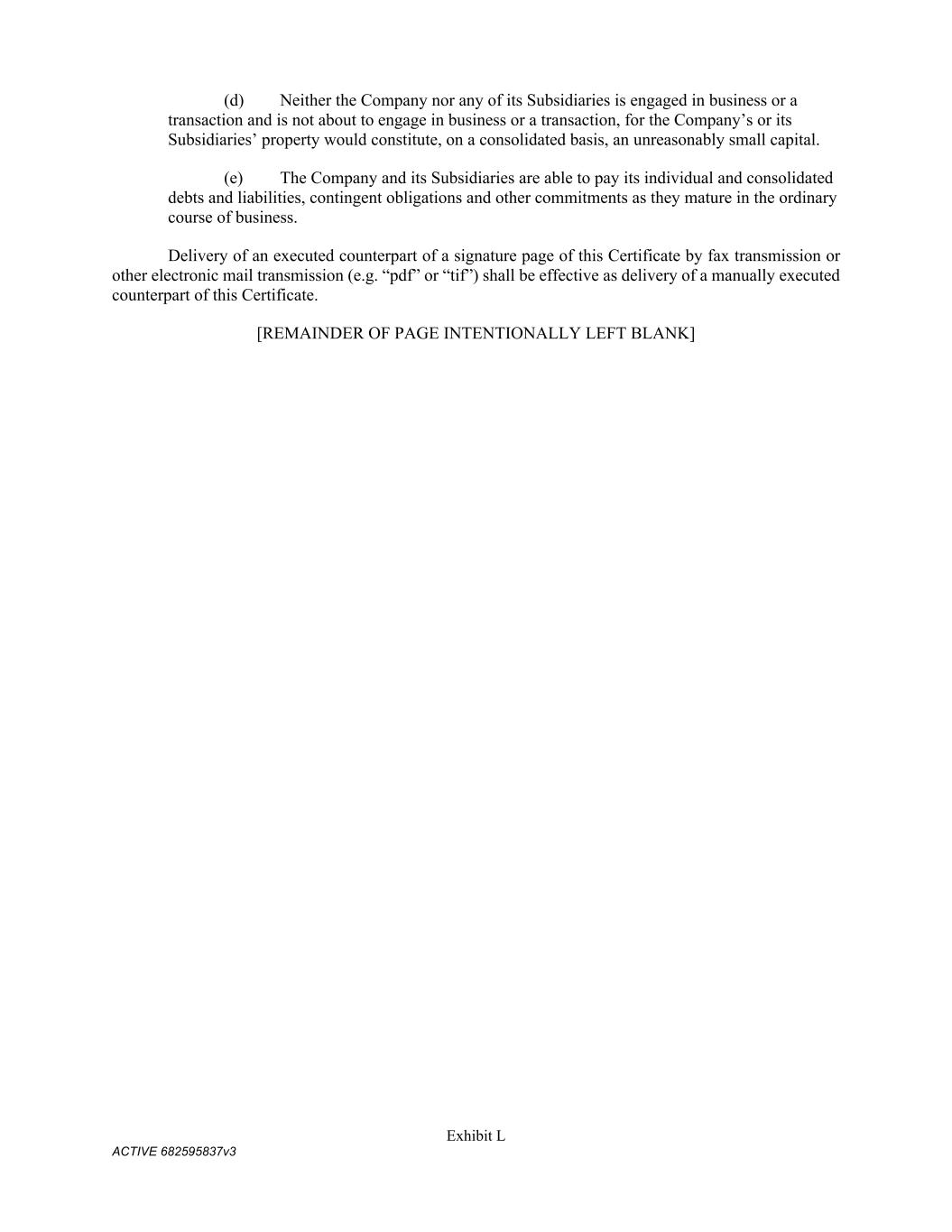 Exhibit L ACTIVE 682595837v3 (d) Neither the Company nor any of its Subsidiaries is engaged in business or a transaction and is not about to engage in business or a transaction, for the Company’s or its Subsidiaries’ property would constitute, on a consolidated basis, an unreasonably small capital. (e) The Company and its Subsidiaries are able to pay its individual and consolidated debts and liabilities, contingent obligations and other commitments as they mature in the ordinary course of business. Delivery of an executed counterpart of a signature page of this Certificate by fax transmission or other electronic mail transmission (e.g. “pdf” or “tif”) shall be effective as delivery of a manually executed counterpart of this Certificate. [REMAINDER OF PAGE INTENTIONALLY LEFT BLANK]