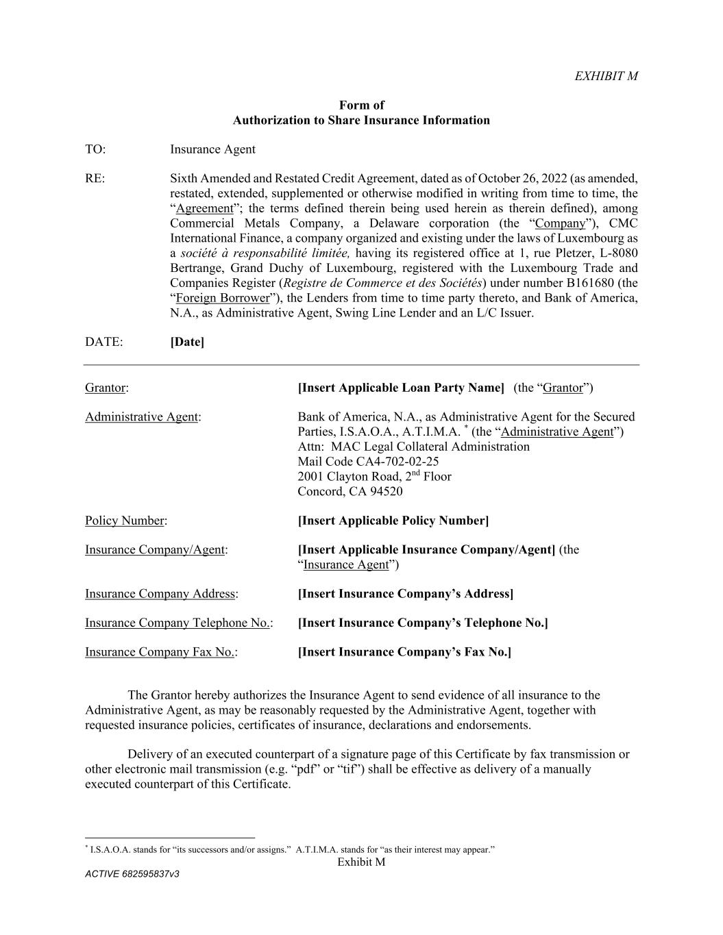 Exhibit M ACTIVE 682595837v3 EXHIBIT M Form of Authorization to Share Insurance Information TO: Insurance Agent RE: Sixth Amended and Restated Credit Agreement, dated as of October 26, 2022 (as amended, restated, extended, supplemented or otherwise modified in writing from time to time, the “Agreement”; the terms defined therein being used herein as therein defined), among Commercial Metals Company, a Delaware corporation (the “Company”), CMC International Finance, a company organized and existing under the laws of Luxembourg as a société à responsabilité limitée, having its registered office at 1, rue Pletzer, L-8080 Bertrange, Grand Duchy of Luxembourg, registered with the Luxembourg Trade and Companies Register (Registre de Commerce et des Sociétés) under number B161680 (the “Foreign Borrower”), the Lenders from time to time party thereto, and Bank of America, N.A., as Administrative Agent, Swing Line Lender and an L/C Issuer. DATE: [Date] Grantor: [Insert Applicable Loan Party Name] (the “Grantor”) Administrative Agent: Bank of America, N.A., as Administrative Agent for the Secured Parties, I.S.A.O.A., A.T.I.M.A. * (the “Administrative Agent”) Attn: MAC Legal Collateral Administration Mail Code CA4-702-02-25 2001 Clayton Road, 2nd Floor Concord, CA 94520 Policy Number: [Insert Applicable Policy Number] Insurance Company/Agent: [Insert Applicable Insurance Company/Agent] (the “Insurance Agent”) Insurance Company Address: [Insert Insurance Company’s Address] Insurance Company Telephone No.: [Insert Insurance Company’s Telephone No.] Insurance Company Fax No.: [Insert Insurance Company’s Fax No.] The Grantor hereby authorizes the Insurance Agent to send evidence of all insurance to the Administrative Agent, as may be reasonably requested by the Administrative Agent, together with requested insurance policies, certificates of insurance, declarations and endorsements. Delivery of an executed counterpart of a signature page of this Certificate by fax transmission or other electronic mail transmission (e.g. “pdf” or “tif”) shall be effective as delivery of a manually executed counterpart of this Certificate. * I.S.A.O.A. stands for “its successors and/or assigns.” A.T.I.M.A. stands for “as their interest may appear.”