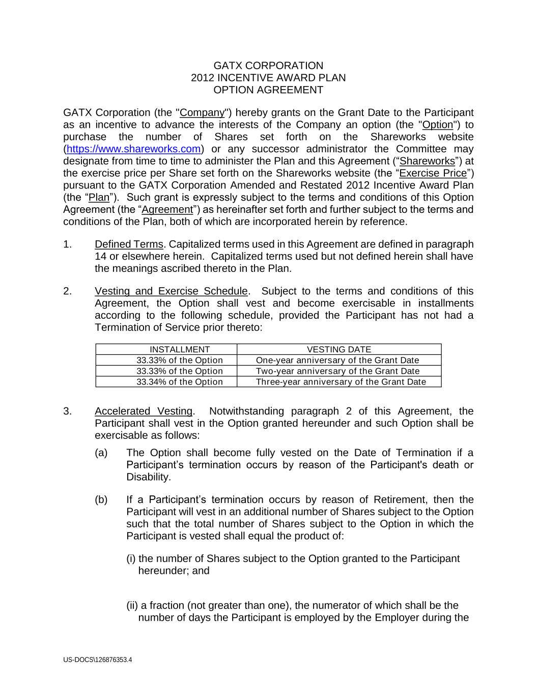 US-DOCS\126876353.4 GATX CORPORATION 2012 INCENTIVE AWARD PLAN OPTION AGREEMENT GATX Corporation (the "Company") hereby grants on the Grant Date to the Participant as an incentive to advance the interests of the Company an option (the "Option") to purchase the number of Shares set forth on the Shareworks website (https://www.shareworks.com) or any successor administrator the Committee may designate from time to time to administer the Plan and this Agreement (“Shareworks”) at the exercise price per Share set forth on the Shareworks website (the “Exercise Price”) pursuant to the GATX Corporation Amended and Restated 2012 Incentive Award Plan (the “Plan”). Such grant is expressly subject to the terms and conditions of this Option Agreement (the “Agreement”) as hereinafter set forth and further subject to the terms and conditions of the Plan, both of which are incorporated herein by reference. 1. Defined Terms. Capitalized terms used in this Agreement are defined in paragraph 14 or elsewhere herein. Capitalized terms used but not defined herein shall have the meanings ascribed thereto in the Plan. 2. Vesting and Exercise Schedule. Subject to the terms and conditions of this Agreement, the Option shall vest and become exercisable in installments according to the following schedule, provided the Participant has not had a Termination of Service prior thereto: INSTALLMENT VESTING DATE 33.33% of the Option One-year anniversary of the Grant Date 33.33% of the Option Two-year anniversary of the Grant Date 33.34% of the Option Three-year anniversary of the Grant Date 3. Accelerated Vesting. Notwithstanding paragraph 2 of this Agreement, the Participant shall vest in the Option granted hereunder and such Option shall be exercisable as follows: (a) The Option shall become fully vested on the Date of Termination if a Participant’s termination occurs by reason of the Participant's death or Disability. (b) If a Participant’s termination occurs by reason of Retirement, then the Participant will vest in an additional number of Shares subject to the Option such that the total number of Shares subject to the Option in which the Participant is vested shall equal the product of: (i) the number of Shares subject to the Option granted to the Participant hereunder; and (ii) a fraction (not greater than one), the numerator of which shall be the number of days the Participant is employed by the Employer during the