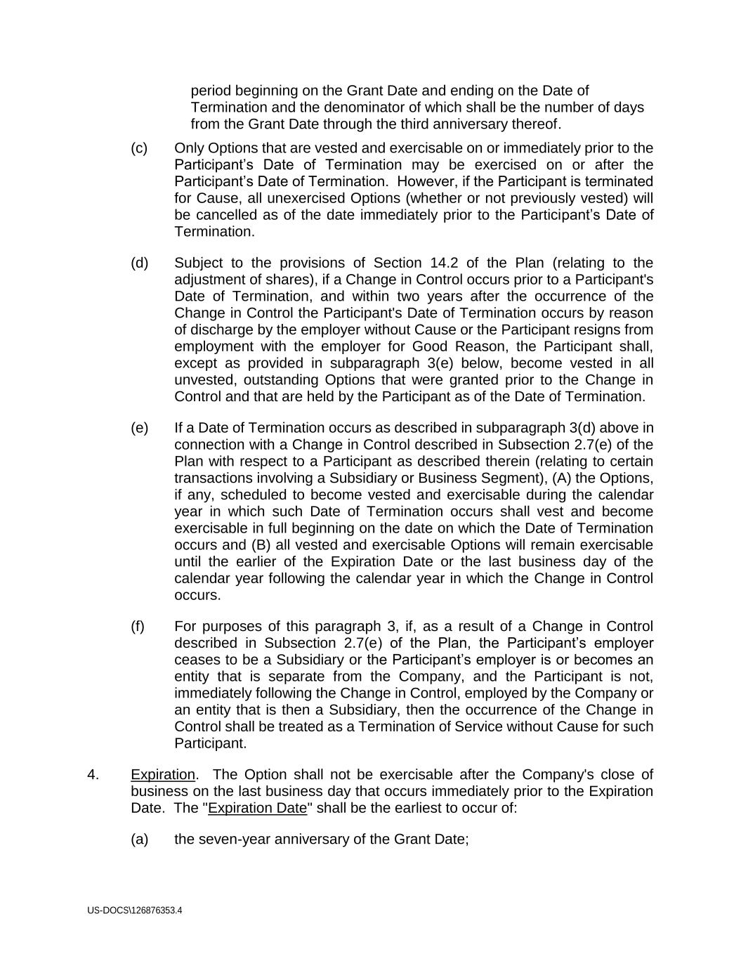 US-DOCS\126876353.4 period beginning on the Grant Date and ending on the Date of Termination and the denominator of which shall be the number of days from the Grant Date through the third anniversary thereof. (c) Only Options that are vested and exercisable on or immediately prior to the Participant’s Date of Termination may be exercised on or after the Participant’s Date of Termination. However, if the Participant is terminated for Cause, all unexercised Options (whether or not previously vested) will be cancelled as of the date immediately prior to the Participant’s Date of Termination. (d) Subject to the provisions of Section 14.2 of the Plan (relating to the adjustment of shares), if a Change in Control occurs prior to a Participant's Date of Termination, and within two years after the occurrence of the Change in Control the Participant's Date of Termination occurs by reason of discharge by the employer without Cause or the Participant resigns from employment with the employer for Good Reason, the Participant shall, except as provided in subparagraph 3(e) below, become vested in all unvested, outstanding Options that were granted prior to the Change in Control and that are held by the Participant as of the Date of Termination. (e) If a Date of Termination occurs as described in subparagraph 3(d) above in connection with a Change in Control described in Subsection 2.7(e) of the Plan with respect to a Participant as described therein (relating to certain transactions involving a Subsidiary or Business Segment), (A) the Options, if any, scheduled to become vested and exercisable during the calendar year in which such Date of Termination occurs shall vest and become exercisable in full beginning on the date on which the Date of Termination occurs and (B) all vested and exercisable Options will remain exercisable until the earlier of the Expiration Date or the last business day of the calendar year following the calendar year in which the Change in Control occurs. (f) For purposes of this paragraph 3, if, as a result of a Change in Control described in Subsection 2.7(e) of the Plan, the Participant’s employer ceases to be a Subsidiary or the Participant’s employer is or becomes an entity that is separate from the Company, and the Participant is not, immediately following the Change in Control, employed by the Company or an entity that is then a Subsidiary, then the occurrence of the Change in Control shall be treated as a Termination of Service without Cause for such Participant. 4. Expiration. The Option shall not be exercisable after the Company's close of business on the last business day that occurs immediately prior to the Expiration Date. The "Expiration Date" shall be the earliest to occur of: (a) the seven-year anniversary of the Grant Date;