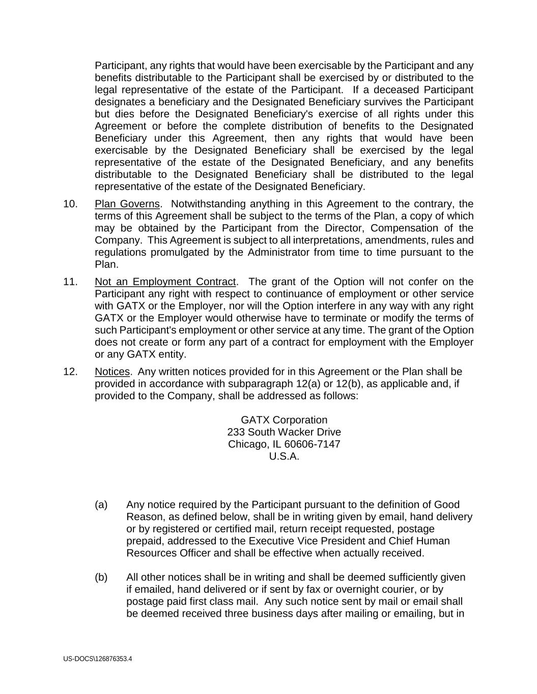 US-DOCS\126876353.4 Participant, any rights that would have been exercisable by the Participant and any benefits distributable to the Participant shall be exercised by or distributed to the legal representative of the estate of the Participant. If a deceased Participant designates a beneficiary and the Designated Beneficiary survives the Participant but dies before the Designated Beneficiary's exercise of all rights under this Agreement or before the complete distribution of benefits to the Designated Beneficiary under this Agreement, then any rights that would have been exercisable by the Designated Beneficiary shall be exercised by the legal representative of the estate of the Designated Beneficiary, and any benefits distributable to the Designated Beneficiary shall be distributed to the legal representative of the estate of the Designated Beneficiary. 10. Plan Governs. Notwithstanding anything in this Agreement to the contrary, the terms of this Agreement shall be subject to the terms of the Plan, a copy of which may be obtained by the Participant from the Director, Compensation of the Company. This Agreement is subject to all interpretations, amendments, rules and regulations promulgated by the Administrator from time to time pursuant to the Plan. 11. Not an Employment Contract. The grant of the Option will not confer on the Participant any right with respect to continuance of employment or other service with GATX or the Employer, nor will the Option interfere in any way with any right GATX or the Employer would otherwise have to terminate or modify the terms of such Participant's employment or other service at any time. The grant of the Option does not create or form any part of a contract for employment with the Employer or any GATX entity. 12. Notices. Any written notices provided for in this Agreement or the Plan shall be provided in accordance with subparagraph 12(a) or 12(b), as applicable and, if provided to the Company, shall be addressed as follows: GATX Corporation 233 South Wacker Drive Chicago, IL 60606-7147 U.S.A. (a) Any notice required by the Participant pursuant to the definition of Good Reason, as defined below, shall be in writing given by email, hand delivery or by registered or certified mail, return receipt requested, postage prepaid, addressed to the Executive Vice President and Chief Human Resources Officer and shall be effective when actually received. (b) All other notices shall be in writing and shall be deemed sufficiently given if emailed, hand delivered or if sent by fax or overnight courier, or by postage paid first class mail. Any such notice sent by mail or email shall be deemed received three business days after mailing or emailing, but in