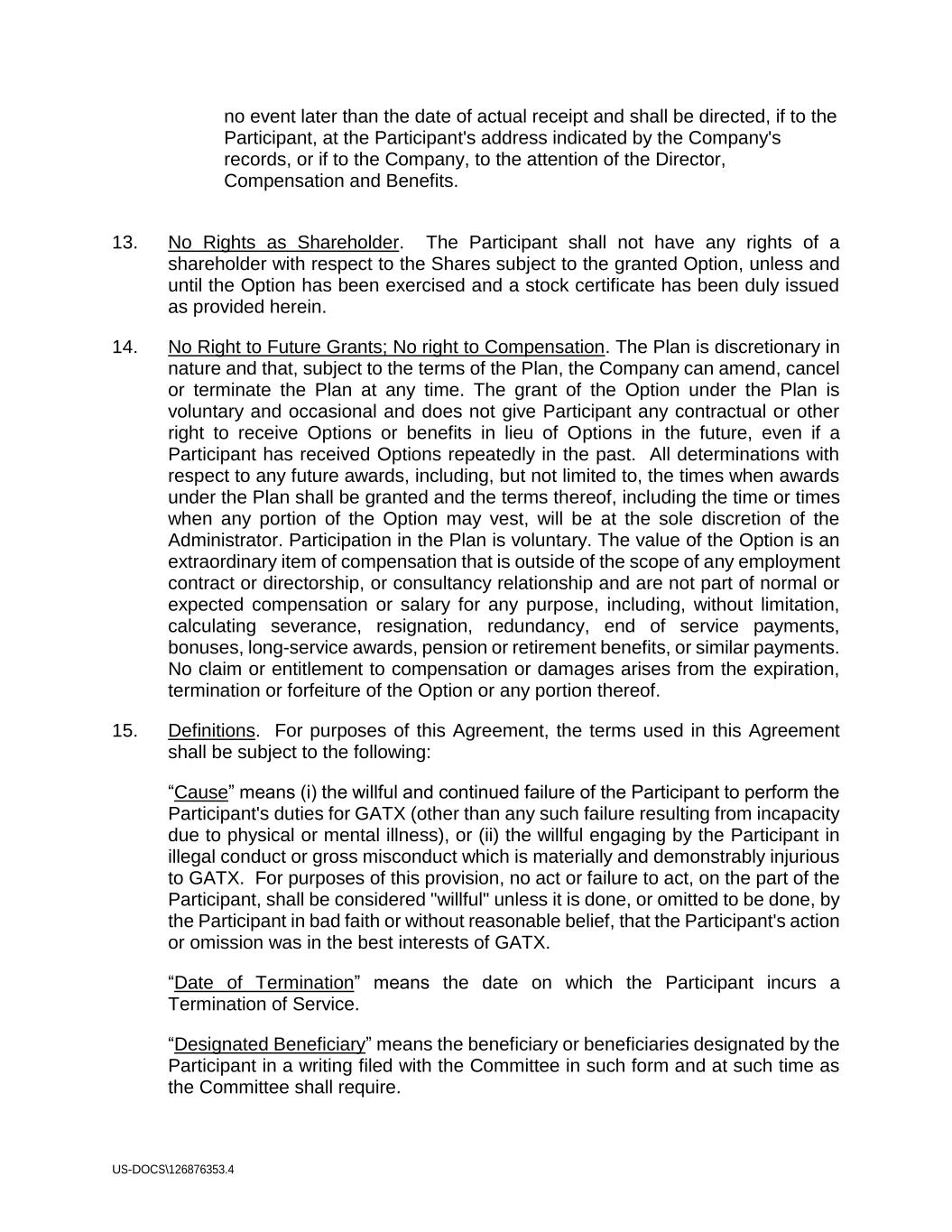 US-DOCS\126876353.4 no event later than the date of actual receipt and shall be directed, if to the Participant, at the Participant's address indicated by the Company's records, or if to the Company, to the attention of the Director, Compensation and Benefits. 13. No Rights as Shareholder. The Participant shall not have any rights of a shareholder with respect to the Shares subject to the granted Option, unless and until the Option has been exercised and a stock certificate has been duly issued as provided herein. 14. No Right to Future Grants; No right to Compensation. The Plan is discretionary in nature and that, subject to the terms of the Plan, the Company can amend, cancel or terminate the Plan at any time. The grant of the Option under the Plan is voluntary and occasional and does not give Participant any contractual or other right to receive Options or benefits in lieu of Options in the future, even if a Participant has received Options repeatedly in the past. All determinations with respect to any future awards, including, but not limited to, the times when awards under the Plan shall be granted and the terms thereof, including the time or times when any portion of the Option may vest, will be at the sole discretion of the Administrator. Participation in the Plan is voluntary. The value of the Option is an extraordinary item of compensation that is outside of the scope of any employment contract or directorship, or consultancy relationship and are not part of normal or expected compensation or salary for any purpose, including, without limitation, calculating severance, resignation, redundancy, end of service payments, bonuses, long-service awards, pension or retirement benefits, or similar payments. No claim or entitlement to compensation or damages arises from the expiration, termination or forfeiture of the Option or any portion thereof. 15. Definitions. For purposes of this Agreement, the terms used in this Agreement shall be subject to the following: “Cause” means (i) the willful and continued failure of the Participant to perform the Participant's duties for GATX (other than any such failure resulting from incapacity due to physical or mental illness), or (ii) the willful engaging by the Participant in illegal conduct or gross misconduct which is materially and demonstrably injurious to GATX. For purposes of this provision, no act or failure to act, on the part of the Participant, shall be considered "willful" unless it is done, or omitted to be done, by the Participant in bad faith or without reasonable belief, that the Participant's action or omission was in the best interests of GATX. “Date of Termination” means the date on which the Participant incurs a Termination of Service. “Designated Beneficiary” means the beneficiary or beneficiaries designated by the Participant in a writing filed with the Committee in such form and at such time as the Committee shall require.