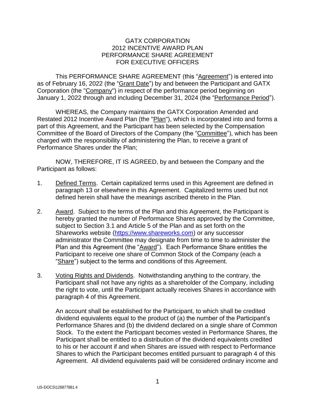 1 US-DOCS\126877881.4 GATX CORPORATION 2012 INCENTIVE AWARD PLAN PERFORMANCE SHARE AGREEMENT FOR EXECUTIVE OFFICERS This PERFORMANCE SHARE AGREEMENT (this “Agreement”) is entered into as of February 16, 2022 (the “Grant Date”) by and between the Participant and GATX Corporation (the "Company") in respect of the performance period beginning on January 1, 2022 through and including December 31, 2024 (the “Performance Period”). WHEREAS, the Company maintains the GATX Corporation Amended and Restated 2012 Incentive Award Plan (the "Plan"), which is incorporated into and forms a part of this Agreement, and the Participant has been selected by the Compensation Committee of the Board of Directors of the Company (the “Committee”), which has been charged with the responsibility of administering the Plan, to receive a grant of Performance Shares under the Plan; NOW, THEREFORE, IT IS AGREED, by and between the Company and the Participant as follows: 1. Defined Terms. Certain capitalized terms used in this Agreement are defined in paragraph 13 or elsewhere in this Agreement. Capitalized terms used but not defined herein shall have the meanings ascribed thereto in the Plan. 2. Award. Subject to the terms of the Plan and this Agreement, the Participant is hereby granted the number of Performance Shares approved by the Committee, subject to Section 3.1 and Article 5 of the Plan and as set forth on the Shareworks website (https://www.shareworks.com) or any successor administrator the Committee may designate from time to time to administer the Plan and this Agreement (the “Award”). Each Performance Share entitles the Participant to receive one share of Common Stock of the Company (each a “Share”) subject to the terms and conditions of this Agreement. 3. Voting Rights and Dividends. Notwithstanding anything to the contrary, the Participant shall not have any rights as a shareholder of the Company, including the right to vote, until the Participant actually receives Shares in accordance with paragraph 4 of this Agreement. An account shall be established for the Participant, to which shall be credited dividend equivalents equal to the product of (a) the number of the Participant’s Performance Shares and (b) the dividend declared on a single share of Common Stock. To the extent the Participant becomes vested in Performance Shares, the Participant shall be entitled to a distribution of the dividend equivalents credited to his or her account if and when Shares are issued with respect to Performance Shares to which the Participant becomes entitled pursuant to paragraph 4 of this Agreement. All dividend equivalents paid will be considered ordinary income and