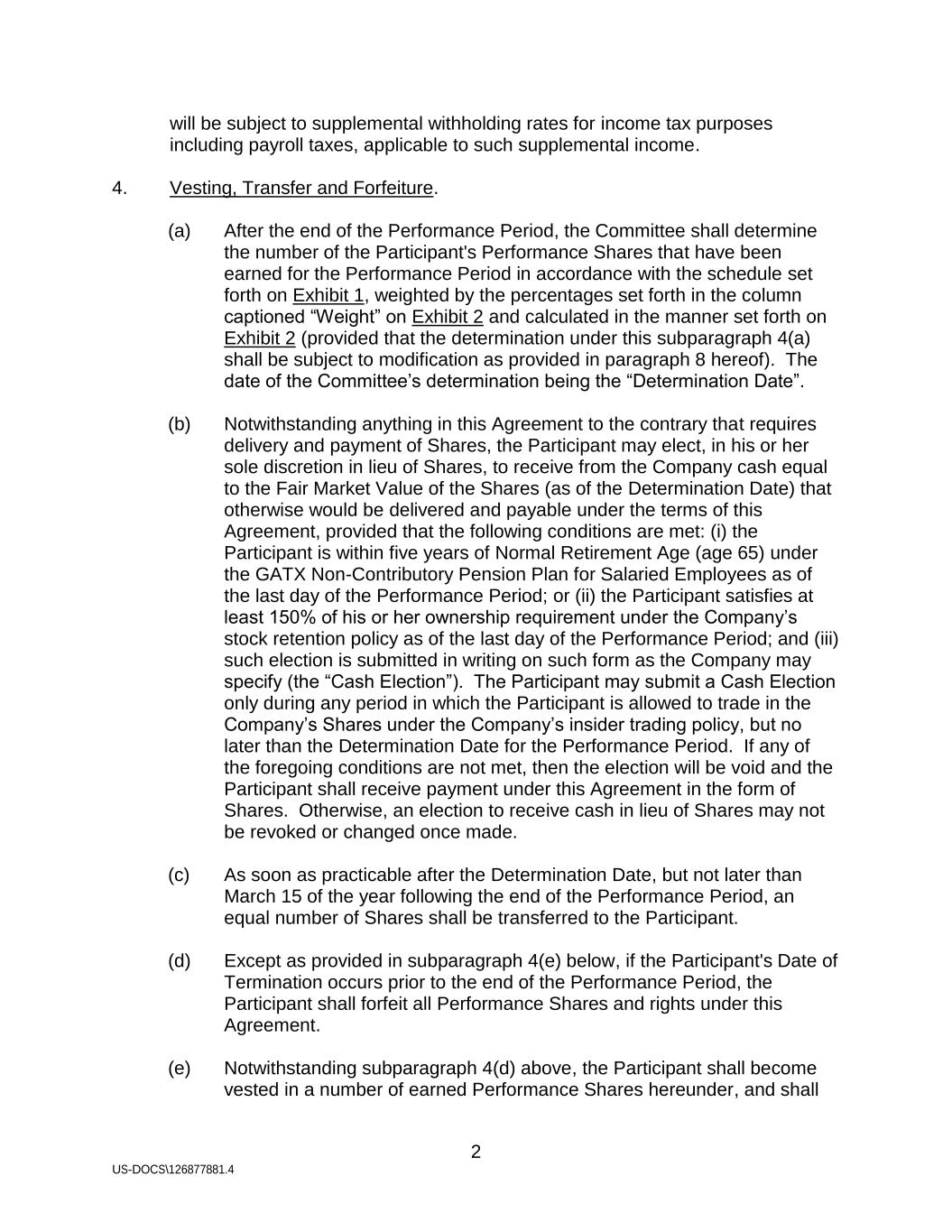 2 US-DOCS\126877881.4 will be subject to supplemental withholding rates for income tax purposes including payroll taxes, applicable to such supplemental income. 4. Vesting, Transfer and Forfeiture. (a) After the end of the Performance Period, the Committee shall determine the number of the Participant's Performance Shares that have been earned for the Performance Period in accordance with the schedule set forth on Exhibit 1, weighted by the percentages set forth in the column captioned “Weight” on Exhibit 2 and calculated in the manner set forth on Exhibit 2 (provided that the determination under this subparagraph 4(a) shall be subject to modification as provided in paragraph 8 hereof). The date of the Committee’s determination being the “Determination Date”. (b) Notwithstanding anything in this Agreement to the contrary that requires delivery and payment of Shares, the Participant may elect, in his or her sole discretion in lieu of Shares, to receive from the Company cash equal to the Fair Market Value of the Shares (as of the Determination Date) that otherwise would be delivered and payable under the terms of this Agreement, provided that the following conditions are met: (i) the Participant is within five years of Normal Retirement Age (age 65) under the GATX Non-Contributory Pension Plan for Salaried Employees as of the last day of the Performance Period; or (ii) the Participant satisfies at least 150% of his or her ownership requirement under the Company’s stock retention policy as of the last day of the Performance Period; and (iii) such election is submitted in writing on such form as the Company may specify (the “Cash Election”). The Participant may submit a Cash Election only during any period in which the Participant is allowed to trade in the Company’s Shares under the Company’s insider trading policy, but no later than the Determination Date for the Performance Period. If any of the foregoing conditions are not met, then the election will be void and the Participant shall receive payment under this Agreement in the form of Shares. Otherwise, an election to receive cash in lieu of Shares may not be revoked or changed once made. (c) As soon as practicable after the Determination Date, but not later than March 15 of the year following the end of the Performance Period, an equal number of Shares shall be transferred to the Participant. (d) Except as provided in subparagraph 4(e) below, if the Participant's Date of Termination occurs prior to the end of the Performance Period, the Participant shall forfeit all Performance Shares and rights under this Agreement. (e) Notwithstanding subparagraph 4(d) above, the Participant shall become vested in a number of earned Performance Shares hereunder, and shall