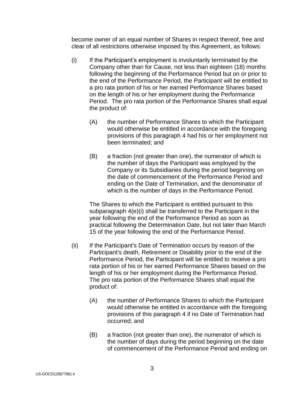 3 US-DOCS\126877881.4 become owner of an equal number of Shares in respect thereof, free and clear of all restrictions otherwise imposed by this Agreement, as follows: (i) If the Participant’s employment is involuntarily terminated by the Company other than for Cause, not less than eighteen (18) months following the beginning of the Performance Period but on or prior to the end of the Performance Period, the Participant will be entitled to a pro rata portion of his or her earned Performance Shares based on the length of his or her employment during the Performance Period. The pro rata portion of the Performance Shares shall equal the product of: (A) the number of Performance Shares to which the Participant would otherwise be entitled in accordance with the foregoing provisions of this paragraph 4 had his or her employment not been terminated; and (B) a fraction (not greater than one), the numerator of which is the number of days the Participant was employed by the Company or its Subsidiaries during the period beginning on the date of commencement of the Performance Period and ending on the Date of Termination, and the denominator of which is the number of days in the Performance Period. The Shares to which the Participant is entitled pursuant to this subparagraph 4(e)(i) shall be transferred to the Participant in the year following the end of the Performance Period as soon as practical following the Determination Date, but not later than March 15 of the year following the end of the Performance Period. (ii) If the Participant's Date of Termination occurs by reason of the Participant's death, Retirement or Disability prior to the end of the Performance Period, the Participant will be entitled to receive a pro rata portion of his or her earned Performance Shares based on the length of his or her employment during the Performance Period. The pro rata portion of the Performance Shares shall equal the product of: (A) the number of Performance Shares to which the Participant would otherwise be entitled in accordance with the foregoing provisions of this paragraph 4 if no Date of Termination had occurred; and (B) a fraction (not greater than one), the numerator of which is the number of days during the period beginning on the date of commencement of the Performance Period and ending on