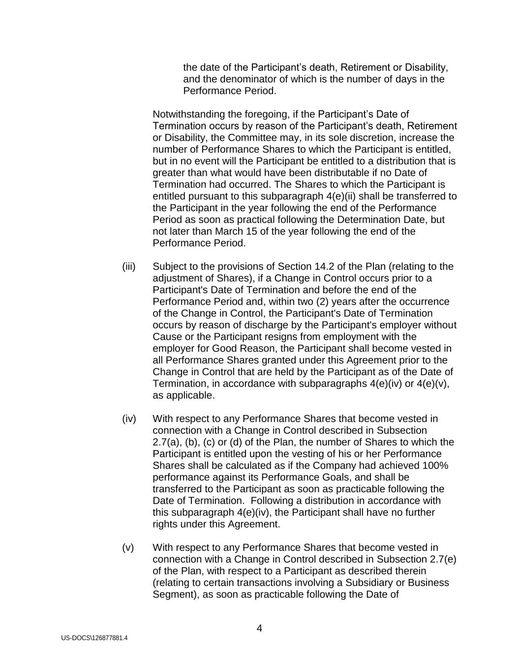4 US-DOCS\126877881.4 the date of the Participant’s death, Retirement or Disability, and the denominator of which is the number of days in the Performance Period. Notwithstanding the foregoing, if the Participant’s Date of Termination occurs by reason of the Participant’s death, Retirement or Disability, the Committee may, in its sole discretion, increase the number of Performance Shares to which the Participant is entitled, but in no event will the Participant be entitled to a distribution that is greater than what would have been distributable if no Date of Termination had occurred. The Shares to which the Participant is entitled pursuant to this subparagraph 4(e)(ii) shall be transferred to the Participant in the year following the end of the Performance Period as soon as practical following the Determination Date, but not later than March 15 of the year following the end of the Performance Period. (iii) Subject to the provisions of Section 14.2 of the Plan (relating to the adjustment of Shares), if a Change in Control occurs prior to a Participant's Date of Termination and before the end of the Performance Period and, within two (2) years after the occurrence of the Change in Control, the Participant's Date of Termination occurs by reason of discharge by the Participant's employer without Cause or the Participant resigns from employment with the employer for Good Reason, the Participant shall become vested in all Performance Shares granted under this Agreement prior to the Change in Control that are held by the Participant as of the Date of Termination, in accordance with subparagraphs 4(e)(iv) or 4(e)(v), as applicable. (iv) With respect to any Performance Shares that become vested in connection with a Change in Control described in Subsection 2.7(a), (b), (c) or (d) of the Plan, the number of Shares to which the Participant is entitled upon the vesting of his or her Performance Shares shall be calculated as if the Company had achieved 100% performance against its Performance Goals, and shall be transferred to the Participant as soon as practicable following the Date of Termination. Following a distribution in accordance with this subparagraph 4(e)(iv), the Participant shall have no further rights under this Agreement. (v) With respect to any Performance Shares that become vested in connection with a Change in Control described in Subsection 2.7(e) of the Plan, with respect to a Participant as described therein (relating to certain transactions involving a Subsidiary or Business Segment), as soon as practicable following the Date of