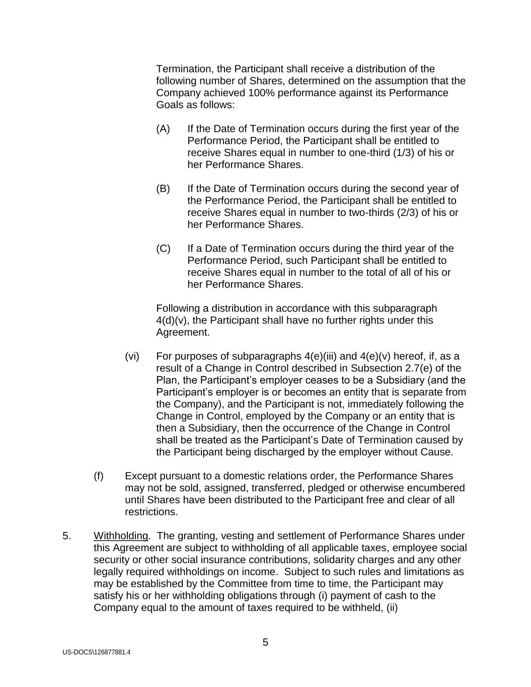 5 US-DOCS\126877881.4 Termination, the Participant shall receive a distribution of the following number of Shares, determined on the assumption that the Company achieved 100% performance against its Performance Goals as follows: (A) If the Date of Termination occurs during the first year of the Performance Period, the Participant shall be entitled to receive Shares equal in number to one-third (1/3) of his or her Performance Shares. (B) If the Date of Termination occurs during the second year of the Performance Period, the Participant shall be entitled to receive Shares equal in number to two-thirds (2/3) of his or her Performance Shares. (C) If a Date of Termination occurs during the third year of the Performance Period, such Participant shall be entitled to receive Shares equal in number to the total of all of his or her Performance Shares. Following a distribution in accordance with this subparagraph 4(d)(v), the Participant shall have no further rights under this Agreement. (vi) For purposes of subparagraphs 4(e)(iii) and 4(e)(v) hereof, if, as a result of a Change in Control described in Subsection 2.7(e) of the Plan, the Participant’s employer ceases to be a Subsidiary (and the Participant’s employer is or becomes an entity that is separate from the Company), and the Participant is not, immediately following the Change in Control, employed by the Company or an entity that is then a Subsidiary, then the occurrence of the Change in Control shall be treated as the Participant’s Date of Termination caused by the Participant being discharged by the employer without Cause. (f) Except pursuant to a domestic relations order, the Performance Shares may not be sold, assigned, transferred, pledged or otherwise encumbered until Shares have been distributed to the Participant free and clear of all restrictions. 5. Withholding. The granting, vesting and settlement of Performance Shares under this Agreement are subject to withholding of all applicable taxes, employee social security or other social insurance contributions, solidarity charges and any other legally required withholdings on income. Subject to such rules and limitations as may be established by the Committee from time to time, the Participant may satisfy his or her withholding obligations through (i) payment of cash to the Company equal to the amount of taxes required to be withheld, (ii)