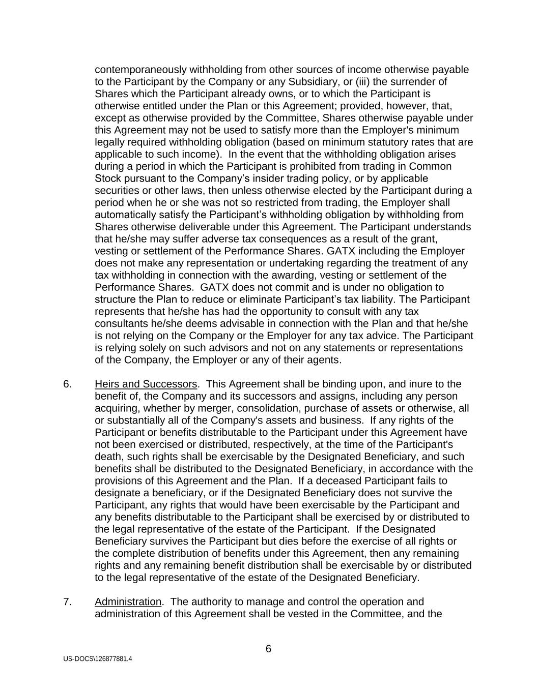 6 US-DOCS\126877881.4 contemporaneously withholding from other sources of income otherwise payable to the Participant by the Company or any Subsidiary, or (iii) the surrender of Shares which the Participant already owns, or to which the Participant is otherwise entitled under the Plan or this Agreement; provided, however, that, except as otherwise provided by the Committee, Shares otherwise payable under this Agreement may not be used to satisfy more than the Employer's minimum legally required withholding obligation (based on minimum statutory rates that are applicable to such income). In the event that the withholding obligation arises during a period in which the Participant is prohibited from trading in Common Stock pursuant to the Company’s insider trading policy, or by applicable securities or other laws, then unless otherwise elected by the Participant during a period when he or she was not so restricted from trading, the Employer shall automatically satisfy the Participant’s withholding obligation by withholding from Shares otherwise deliverable under this Agreement. The Participant understands that he/she may suffer adverse tax consequences as a result of the grant, vesting or settlement of the Performance Shares. GATX including the Employer does not make any representation or undertaking regarding the treatment of any tax withholding in connection with the awarding, vesting or settlement of the Performance Shares. GATX does not commit and is under no obligation to structure the Plan to reduce or eliminate Participant’s tax liability. The Participant represents that he/she has had the opportunity to consult with any tax consultants he/she deems advisable in connection with the Plan and that he/she is not relying on the Company or the Employer for any tax advice. The Participant is relying solely on such advisors and not on any statements or representations of the Company, the Employer or any of their agents. 6. Heirs and Successors. This Agreement shall be binding upon, and inure to the benefit of, the Company and its successors and assigns, including any person acquiring, whether by merger, consolidation, purchase of assets or otherwise, all or substantially all of the Company's assets and business. If any rights of the Participant or benefits distributable to the Participant under this Agreement have not been exercised or distributed, respectively, at the time of the Participant's death, such rights shall be exercisable by the Designated Beneficiary, and such benefits shall be distributed to the Designated Beneficiary, in accordance with the provisions of this Agreement and the Plan. If a deceased Participant fails to designate a beneficiary, or if the Designated Beneficiary does not survive the Participant, any rights that would have been exercisable by the Participant and any benefits distributable to the Participant shall be exercised by or distributed to the legal representative of the estate of the Participant. If the Designated Beneficiary survives the Participant but dies before the exercise of all rights or the complete distribution of benefits under this Agreement, then any remaining rights and any remaining benefit distribution shall be exercisable by or distributed to the legal representative of the estate of the Designated Beneficiary. 7. Administration. The authority to manage and control the operation and administration of this Agreement shall be vested in the Committee, and the
