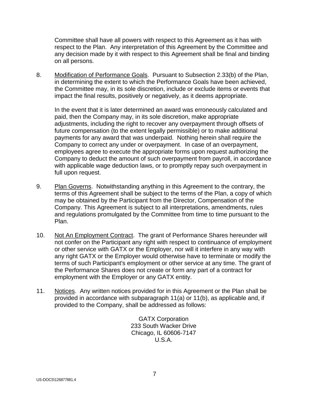 7 US-DOCS\126877881.4 Committee shall have all powers with respect to this Agreement as it has with respect to the Plan. Any interpretation of this Agreement by the Committee and any decision made by it with respect to this Agreement shall be final and binding on all persons. 8. Modification of Performance Goals. Pursuant to Subsection 2.33(b) of the Plan, in determining the extent to which the Performance Goals have been achieved, the Committee may, in its sole discretion, include or exclude items or events that impact the final results, positively or negatively, as it deems appropriate. In the event that it is later determined an award was erroneously calculated and paid, then the Company may, in its sole discretion, make appropriate adjustments, including the right to recover any overpayment through offsets of future compensation (to the extent legally permissible) or to make additional payments for any award that was underpaid. Nothing herein shall require the Company to correct any under or overpayment. In case of an overpayment, employees agree to execute the appropriate forms upon request authorizing the Company to deduct the amount of such overpayment from payroll, in accordance with applicable wage deduction laws, or to promptly repay such overpayment in full upon request. 9. Plan Governs. Notwithstanding anything in this Agreement to the contrary, the terms of this Agreement shall be subject to the terms of the Plan, a copy of which may be obtained by the Participant from the Director, Compensation of the Company. This Agreement is subject to all interpretations, amendments, rules and regulations promulgated by the Committee from time to time pursuant to the Plan. 10. Not An Employment Contract. The grant of Performance Shares hereunder will not confer on the Participant any right with respect to continuance of employment or other service with GATX or the Employer, nor will it interfere in any way with any right GATX or the Employer would otherwise have to terminate or modify the terms of such Participant's employment or other service at any time. The grant of the Performance Shares does not create or form any part of a contract for employment with the Employer or any GATX entity. 11. Notices. Any written notices provided for in this Agreement or the Plan shall be provided in accordance with subparagraph 11(a) or 11(b), as applicable and, if provided to the Company, shall be addressed as follows: GATX Corporation 233 South Wacker Drive Chicago, IL 60606-7147 U.S.A.