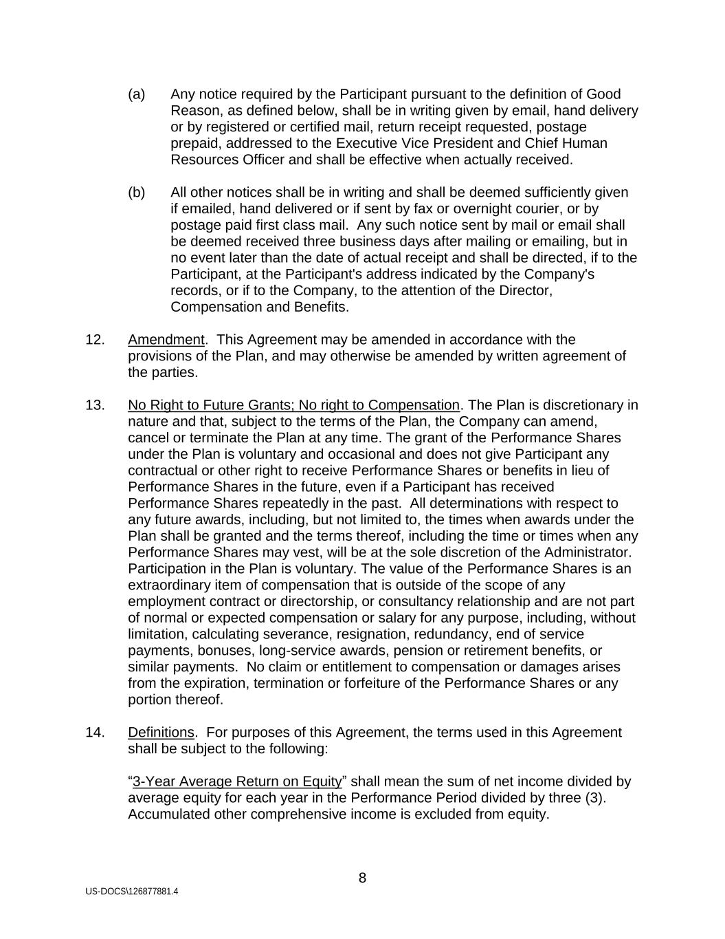 8 US-DOCS\126877881.4 (a) Any notice required by the Participant pursuant to the definition of Good Reason, as defined below, shall be in writing given by email, hand delivery or by registered or certified mail, return receipt requested, postage prepaid, addressed to the Executive Vice President and Chief Human Resources Officer and shall be effective when actually received. (b) All other notices shall be in writing and shall be deemed sufficiently given if emailed, hand delivered or if sent by fax or overnight courier, or by postage paid first class mail. Any such notice sent by mail or email shall be deemed received three business days after mailing or emailing, but in no event later than the date of actual receipt and shall be directed, if to the Participant, at the Participant's address indicated by the Company's records, or if to the Company, to the attention of the Director, Compensation and Benefits. 12. Amendment. This Agreement may be amended in accordance with the provisions of the Plan, and may otherwise be amended by written agreement of the parties. 13. No Right to Future Grants; No right to Compensation. The Plan is discretionary in nature and that, subject to the terms of the Plan, the Company can amend, cancel or terminate the Plan at any time. The grant of the Performance Shares under the Plan is voluntary and occasional and does not give Participant any contractual or other right to receive Performance Shares or benefits in lieu of Performance Shares in the future, even if a Participant has received Performance Shares repeatedly in the past. All determinations with respect to any future awards, including, but not limited to, the times when awards under the Plan shall be granted and the terms thereof, including the time or times when any Performance Shares may vest, will be at the sole discretion of the Administrator. Participation in the Plan is voluntary. The value of the Performance Shares is an extraordinary item of compensation that is outside of the scope of any employment contract or directorship, or consultancy relationship and are not part of normal or expected compensation or salary for any purpose, including, without limitation, calculating severance, resignation, redundancy, end of service payments, bonuses, long-service awards, pension or retirement benefits, or similar payments. No claim or entitlement to compensation or damages arises from the expiration, termination or forfeiture of the Performance Shares or any portion thereof. 14. Definitions. For purposes of this Agreement, the terms used in this Agreement shall be subject to the following: “3-Year Average Return on Equity” shall mean the sum of net income divided by average equity for each year in the Performance Period divided by three (3). Accumulated other comprehensive income is excluded from equity.