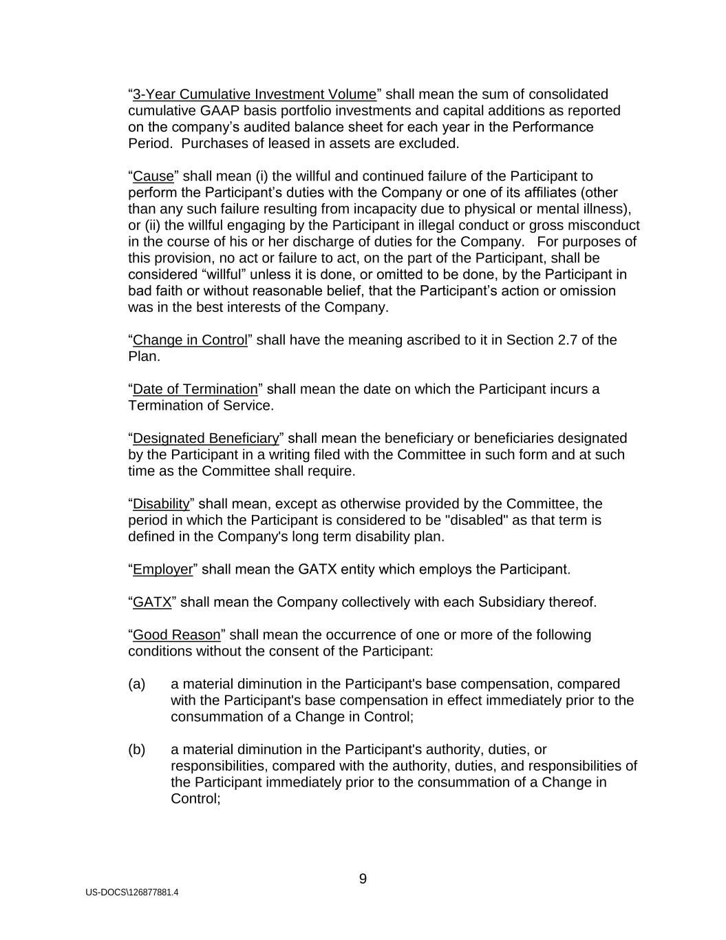 9 US-DOCS\126877881.4 “3-Year Cumulative Investment Volume” shall mean the sum of consolidated cumulative GAAP basis portfolio investments and capital additions as reported on the company’s audited balance sheet for each year in the Performance Period. Purchases of leased in assets are excluded. “Cause” shall mean (i) the willful and continued failure of the Participant to perform the Participant’s duties with the Company or one of its affiliates (other than any such failure resulting from incapacity due to physical or mental illness), or (ii) the willful engaging by the Participant in illegal conduct or gross misconduct in the course of his or her discharge of duties for the Company. For purposes of this provision, no act or failure to act, on the part of the Participant, shall be considered “willful” unless it is done, or omitted to be done, by the Participant in bad faith or without reasonable belief, that the Participant’s action or omission was in the best interests of the Company. “Change in Control” shall have the meaning ascribed to it in Section 2.7 of the Plan. “Date of Termination” shall mean the date on which the Participant incurs a Termination of Service. “Designated Beneficiary” shall mean the beneficiary or beneficiaries designated by the Participant in a writing filed with the Committee in such form and at such time as the Committee shall require. “Disability” shall mean, except as otherwise provided by the Committee, the period in which the Participant is considered to be "disabled" as that term is defined in the Company's long term disability plan. “Employer” shall mean the GATX entity which employs the Participant. “GATX” shall mean the Company collectively with each Subsidiary thereof. “Good Reason” shall mean the occurrence of one or more of the following conditions without the consent of the Participant: (a) a material diminution in the Participant's base compensation, compared with the Participant's base compensation in effect immediately prior to the consummation of a Change in Control; (b) a material diminution in the Participant's authority, duties, or responsibilities, compared with the authority, duties, and responsibilities of the Participant immediately prior to the consummation of a Change in Control;