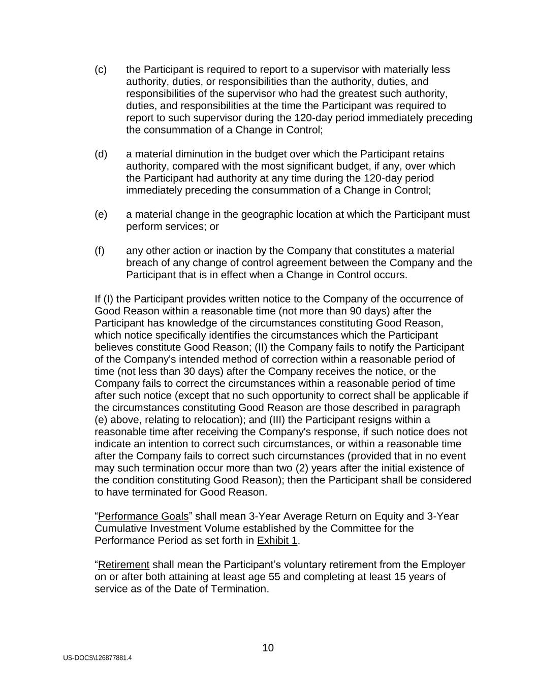 10 US-DOCS\126877881.4 (c) the Participant is required to report to a supervisor with materially less authority, duties, or responsibilities than the authority, duties, and responsibilities of the supervisor who had the greatest such authority, duties, and responsibilities at the time the Participant was required to report to such supervisor during the 120-day period immediately preceding the consummation of a Change in Control; (d) a material diminution in the budget over which the Participant retains authority, compared with the most significant budget, if any, over which the Participant had authority at any time during the 120-day period immediately preceding the consummation of a Change in Control; (e) a material change in the geographic location at which the Participant must perform services; or (f) any other action or inaction by the Company that constitutes a material breach of any change of control agreement between the Company and the Participant that is in effect when a Change in Control occurs. If (I) the Participant provides written notice to the Company of the occurrence of Good Reason within a reasonable time (not more than 90 days) after the Participant has knowledge of the circumstances constituting Good Reason, which notice specifically identifies the circumstances which the Participant believes constitute Good Reason; (II) the Company fails to notify the Participant of the Company's intended method of correction within a reasonable period of time (not less than 30 days) after the Company receives the notice, or the Company fails to correct the circumstances within a reasonable period of time after such notice (except that no such opportunity to correct shall be applicable if the circumstances constituting Good Reason are those described in paragraph (e) above, relating to relocation); and (III) the Participant resigns within a reasonable time after receiving the Company's response, if such notice does not indicate an intention to correct such circumstances, or within a reasonable time after the Company fails to correct such circumstances (provided that in no event may such termination occur more than two (2) years after the initial existence of the condition constituting Good Reason); then the Participant shall be considered to have terminated for Good Reason. “Performance Goals” shall mean 3-Year Average Return on Equity and 3-Year Cumulative Investment Volume established by the Committee for the Performance Period as set forth in Exhibit 1. “Retirement shall mean the Participant’s voluntary retirement from the Employer on or after both attaining at least age 55 and completing at least 15 years of service as of the Date of Termination.