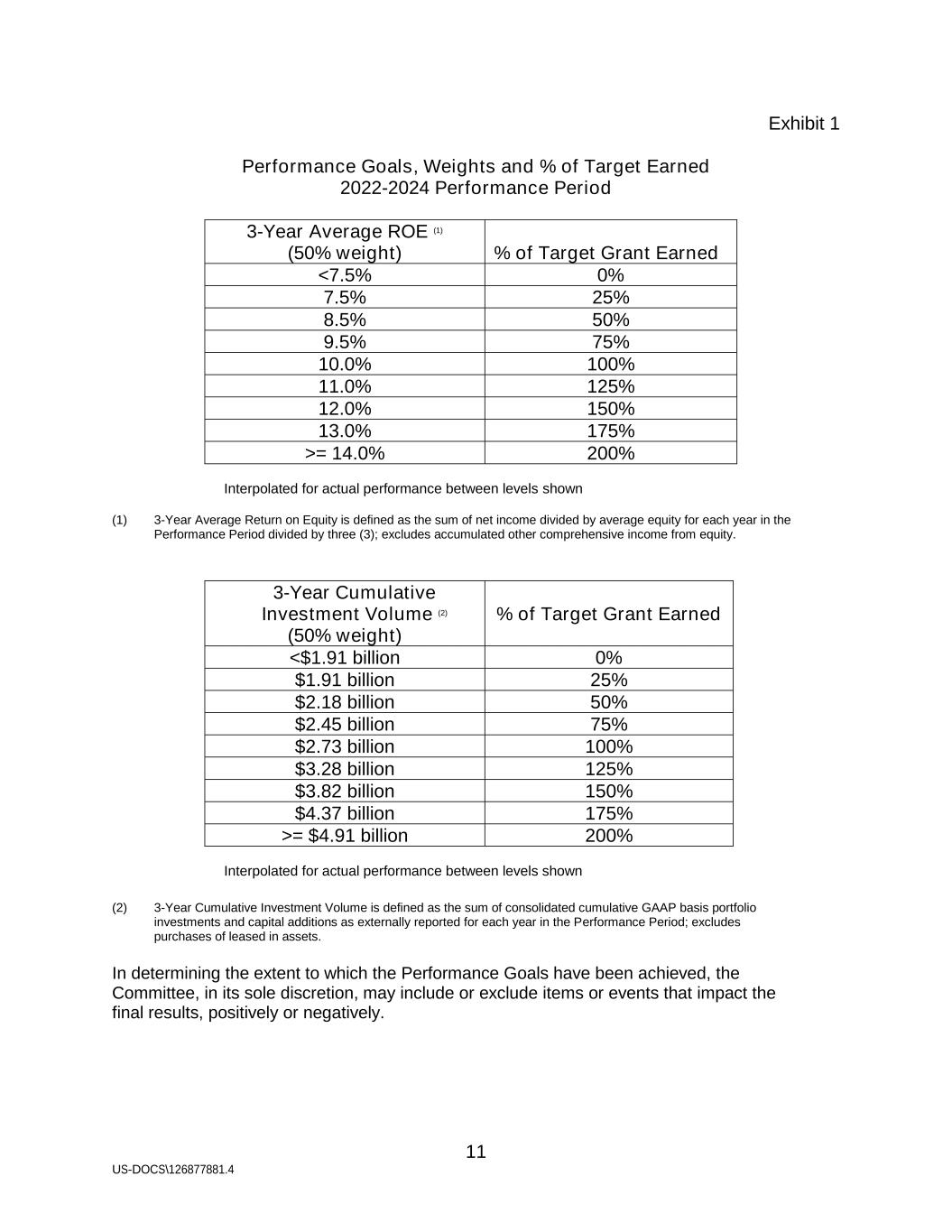 11 US-DOCS\126877881.4 Exhibit 1 Performance Goals, Weights and % of Target Earned 2022-2024 Performance Period 3-Year Average ROE (1) (50% weight) % of Target Grant Earned <7.5% 0% 7.5% 25% 8.5% 50% 9.5% 75% 10.0% 100% 11.0% 125% 12.0% 150% 13.0% 175% >= 14.0% 200% Interpolated for actual performance between levels shown (1) 3-Year Average Return on Equity is defined as the sum of net income divided by average equity for each year in the Performance Period divided by three (3); excludes accumulated other comprehensive income from equity. 3-Year Cumulative Investment Volume (2) (50% weight) % of Target Grant Earned <$1.91 billion 0% $1.91 billion 25% $2.18 billion 50% $2.45 billion 75% $2.73 billion 100% $3.28 billion 125% $3.82 billion 150% $4.37 billion 175% >= $4.91 billion 200% Interpolated for actual performance between levels shown (2) 3-Year Cumulative Investment Volume is defined as the sum of consolidated cumulative GAAP basis portfolio investments and capital additions as externally reported for each year in the Performance Period; excludes purchases of leased in assets. In determining the extent to which the Performance Goals have been achieved, the Committee, in its sole discretion, may include or exclude items or events that impact the final results, positively or negatively.